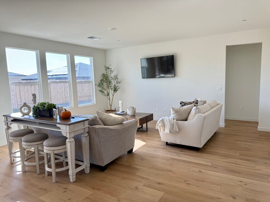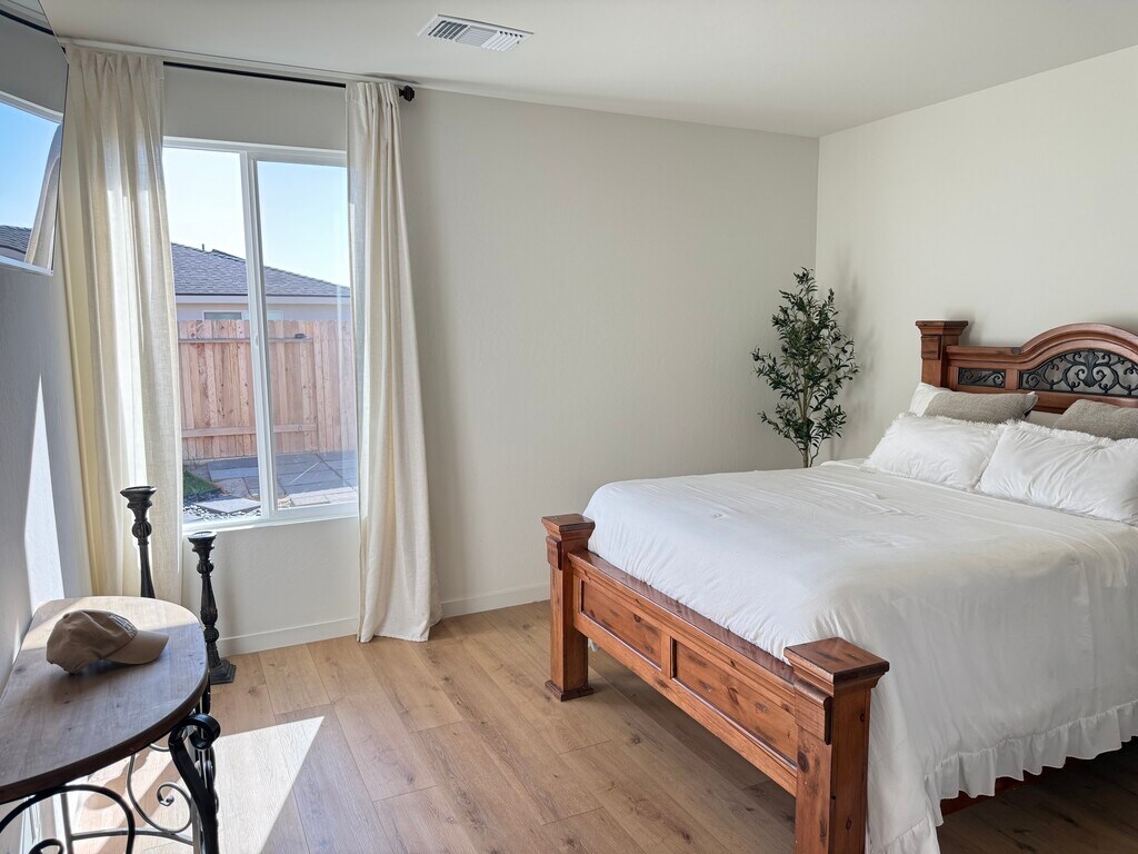 Discover this charming Spanish style 3-bedroom, 2 full bath new construction home in the desirable Almond Creek neighborhood, just five minutes from dining, shopping, schools, highways, and more. This home offers ample space for comfortable living, with an open concept living area where natural light flows right into the great room and modern kitchen equipped with a dishwasher, modern range with oven, microwave, and an island ideal for daily meals or hosting family and friends. Some of the features you will enjoy are white cabinets with hardware, wood-like tile flooring throughout the house, quartz countertops, kitchen backsplash, and a walk-in pantry that is sure to please everyone. Three spacious bedrooms offer a split-wing and include a primary suite with a walk-in closet and an en-suite bathroom that has a walk-in shower and toilet room for privacy. There is a laundry room with cabinets for storing all cleaning supplies, as well as a separate closet room for additional storage. The home is equipped with a modern HVAC system to keep you cool during the warm California summer and an attached two-car garage to provide secure and convenient parking. There is an extended driveway ideal for an RV or additional parking that accommodates up to four vehicles comfortably. This home is environmentally friendly, featuring solar panels for energy efficiency and maintaining energy costs low. There is an attached patio in the back yard that is great for morning coffee or quiet moments. This beautiful new home offers the perfect balance of comfort and convenience in a kid-friendly and quiet community. Experience the best of Northwest Bakersfield living in this charming home with spectacular views of nature such as the morning rise over the Sierra Mountains. Owner will provide rental application to interested applicants upon direct contact. A background and credit check will be required. Home is occupied, please do not disturb.
