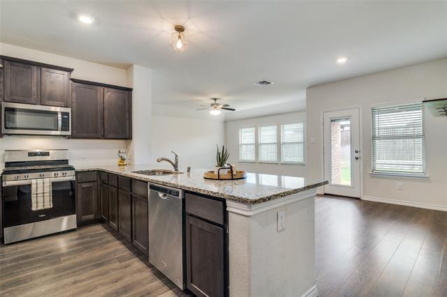 Welcome to this well-maintained one-story home in the desirable Williamsburg community located within Rockwall ISD. Families will love the convenience of an elementary school on site and the brand-new middle school that opened this year, both just a short walk away. This home offers 4 bedrooms and 2 full baths with a smart split-bedroom floor plan designed for comfort and flexibility. The 4th bedroom, positioned at the front of the home, works perfectly as a home office, guest room, or playroom. The spacious living area features an open concept design with plenty of natural light, making it easy to enjoy everyday living and hosting friends or family. The kitchen is the heart of the home, featuring Whirlpool stainless steel appliances, a gas range, granite countertops, a large center island, a walk-in pantry, and abundant cabinet and counter space. The kitchen flows seamlessly into the dining and living spaces, ideal for today’s lifestyle. The primary suite is a relaxing retreat with a spacious bath that includes walk-in shower, dual vanities, and a large walk-in closet. Secondary bedrooms are thoughtfully separated, offering privacy and flexibility for family members or guests. Step outside to enjoy the extended backyard, perfect for outdoor activities, gardening, or entertaining. With sidewalks, community amenities, and schools nearby, this location combines convenience with a welcoming neighborhood atmosphere. Don’t miss the opportunity to make this home yours—schedule your showing today!
