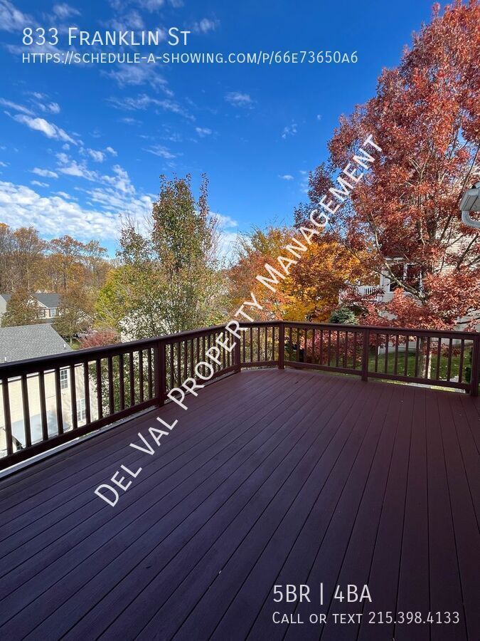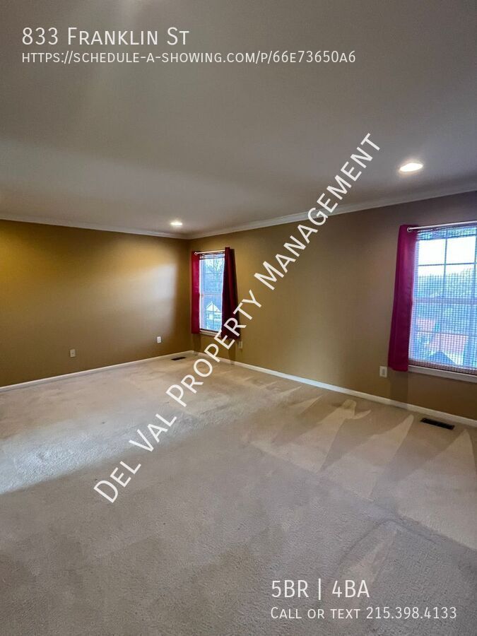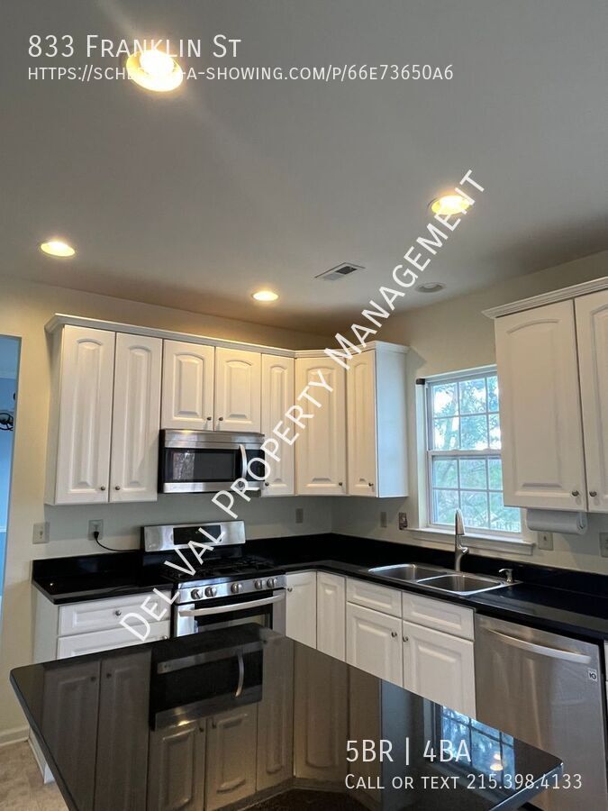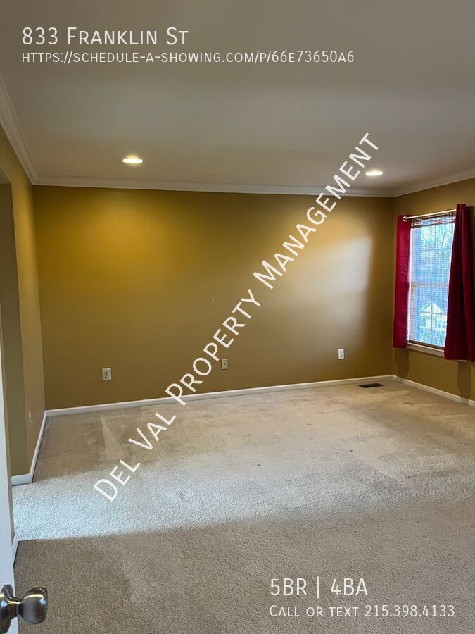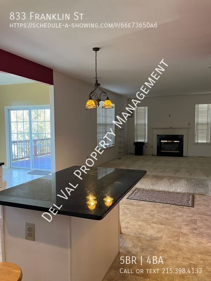833 Franklin Street, Coatesville, PA 19320 $3,315/month, Available Now, Tenant pays all utilities, Landscaping & snow removal tenant responsibility, Trash included. Pets considered with owner approval. Welcome home to this stunning 5-bedroom, 3.5-bath property that perfectly combines modern comfort, open-concept living, and an entertainer’s dream layout. This spacious home offers style, function, and beautiful surroundings—ideal for everyday living or hosting friends and family this holiday season. Step into a bright, open floor plan with a sunny living and dining area, perfect for entertaining. The modern kitchen features stainless steel appliances and opens to a cozy lounge area complete with a fireplace and built-in sound system—a perfect spot for relaxing or entertaining. Enjoy the outdoors on your huge deck overlooking lush greenery, ideal for morning coffee or weekend get-togethers. A half bath and laundry area are conveniently located on the main level, with direct access to the attached garage. Upstairs, you’ll find four spacious bedrooms, including a gorgeous primary suite with two walk-in closets and a spa-like ensuite bathroom featuring a jetted soaking tub, steam shower, and dual vanity. The finished lower level includes a full bath, washer and dryer, full kitchenette (with dishwasher), and private deck perfect as a guest suite or in-law setup. Home Highlights 5 Bedrooms, 3.5 Bathrooms Open-Concept Living & Dining Areas Stainless Steel Kitchen Appliances Fireplace & Built-In Sound System Expansive Deck with Scenic Views Finished Lower Level with Kitchenette & Private Deck Spa-Like Primary Suite with Steam Shower & Soaking Tub Attached Garage + Laundry Areas on Two Levels Bright, Spacious Interior with Modern Comforts Additional Details Application fee: $65 per applicant Pets: Considered with owner approval (+pet deposit) Management: Del Val Realty & Property Management Schedule your showing today! Call or visit to apply or schedule a private tour. Listed by: Del Val Realty & Property Management 49 E. Lancaster Avenue, Suite 300, Malvern, PA 19355 Trash
