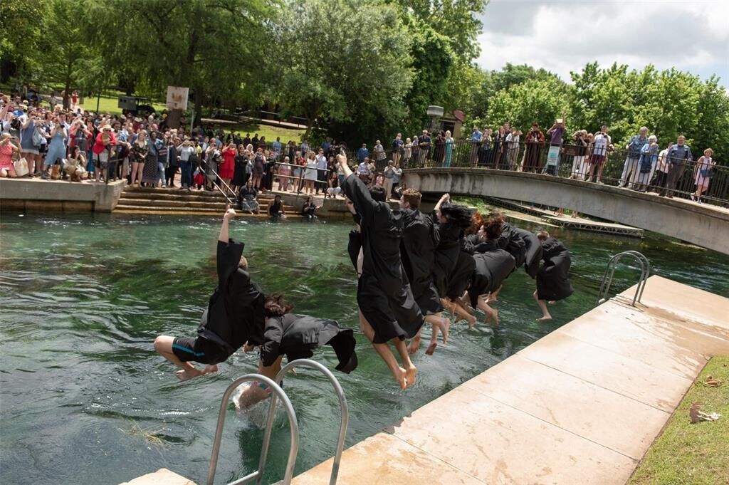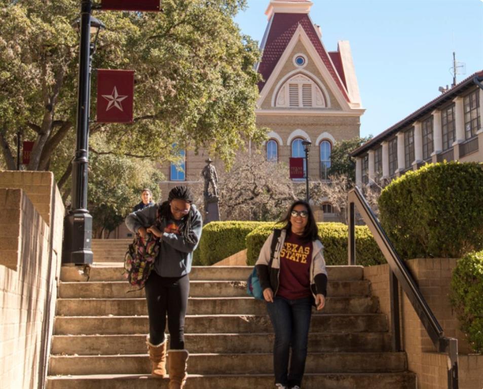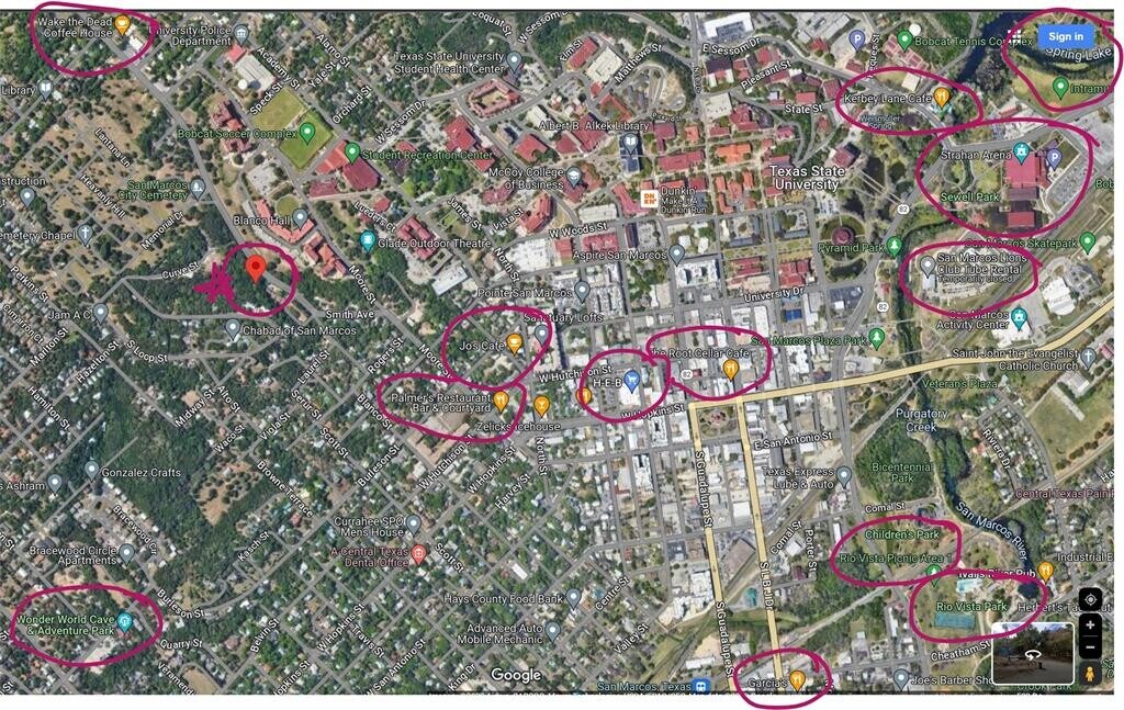AVAILABLE JANUARY 1, 2026. ACROSS THE STREET FROM TEXAS STATE UNIVERSITY CAMPUS! Chateau Azure: Updated 2 story home with fantastic views of Texas State University from the front porch and balcony. Wooded views out the back & side. Peaceful wooded setting with frequent deer & fox sightings * Unbeatable Location: Walking distance to campus- directly across from Blanco Hall * Steps from the TXST campus frisbee golf course * Easy walk to downtown San Marcos' eclectic shops and restaurants * Close to grocery stores and shopping * Minutes from the spring-fed San Marcos River * Car-free living * This rare find combines the serenity of a wooded retreat with the convenience of campus and city living. Huge kitchen can accommodate multiple cooks and eaters. Enormous bedrooms can fit 2 beds and 2 desks each, if desired. No carpet. Refinished floors & new lighting/fixtures. Walk to Harris Dining Hall or make home-cooked meals. This is a single family home without the occupancy restrictions! Mixed-use zoning allows for commercial use: Retail, office, Bed & Breakfast, residential over commercial. Yellow house next door- 835 Old Ranch Road 12, MLS # 9608415- is also available for lease under the same zoning category and is fully furnished. Live in one house and run a business out of out the other! Perfect for students, faculty, or anyone seeking a peaceful yet connected lifestyle in lovely San Marvelous, TX.