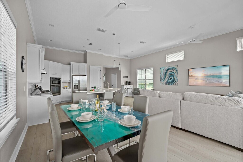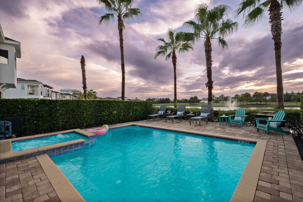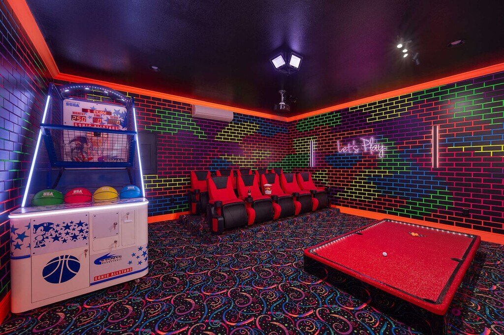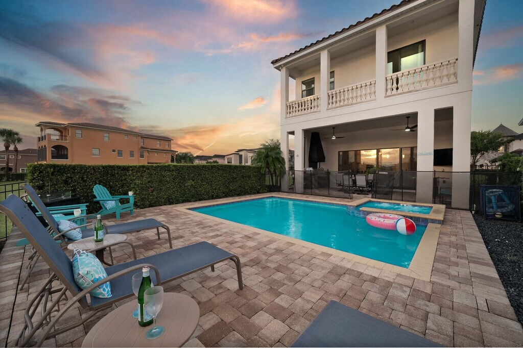 Experience luxury and comfort in this exquisite 5-bedroom villa located in the prestigious Reunion community. With stunning views and endless amenities, this villa offers a private heated pool and spa, a themed theater and game room, and stylish modern interiors. Situated just 4 miles from Disney, 14 miles from Universal, and 12 miles from SeaWorld, this home provides a perfect blend of relaxation and fun near Orlando's top attractions. This villa features 5 spacious bedrooms and 5.5 bathrooms, along with two large living areas. Enjoy the convenience of a free washer and dryer and a large kitchen equipped with stainless steel appliances. The cinema room and pool with spa, which can be heated, add to the luxury experience. Located in the vibrant Reunion community, this home is designed for both relaxation and entertainment. Pool and spa heating is available for an additional cost of $50 per day, with a week's notice required for arrangement. The villa welcomes one house-trained dog with prior approval, subject to a pet fee and a potential security deposit of up to $150. Parking accommodates up to two vehicles in the driveway. Reunion is a luxury gated community known for its golf courses and vibrant atmosphere. While many residents live here full-time, visitors can enjoy a leisurely stroll or drive at a safe speed of 25 MPH, watching for golf carts. The community is surrounded by a variety of dining options, alligator farms, airboat rides, water parks, and other attractions. A car is recommended for exploring Orlando's attractions, with easy access to I-4 and on-site parking available in the driveway and garage. The villa is professionally cleaned and sanitized between guests. Check-out time is 10 AM, and late check-outs may incur a fee of up to $300. The home is self-catering, providing initial supplies but not refills during your stay. Quiet hours are from 10 PM to 8 AM, and the villa is not baby-proofed. No smoking, drugs, or parties are allowed on the property, and violations may result in fines or reservation termination. The villa accommodates a maximum of 12 guests, and only registered guests are allowed overnight. Please respect the neighborhood and adhere to all posted guidelines within the home.