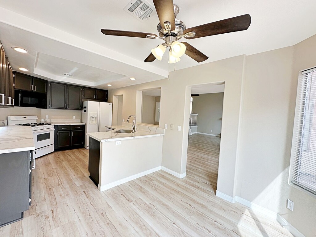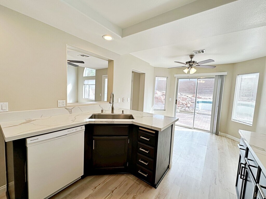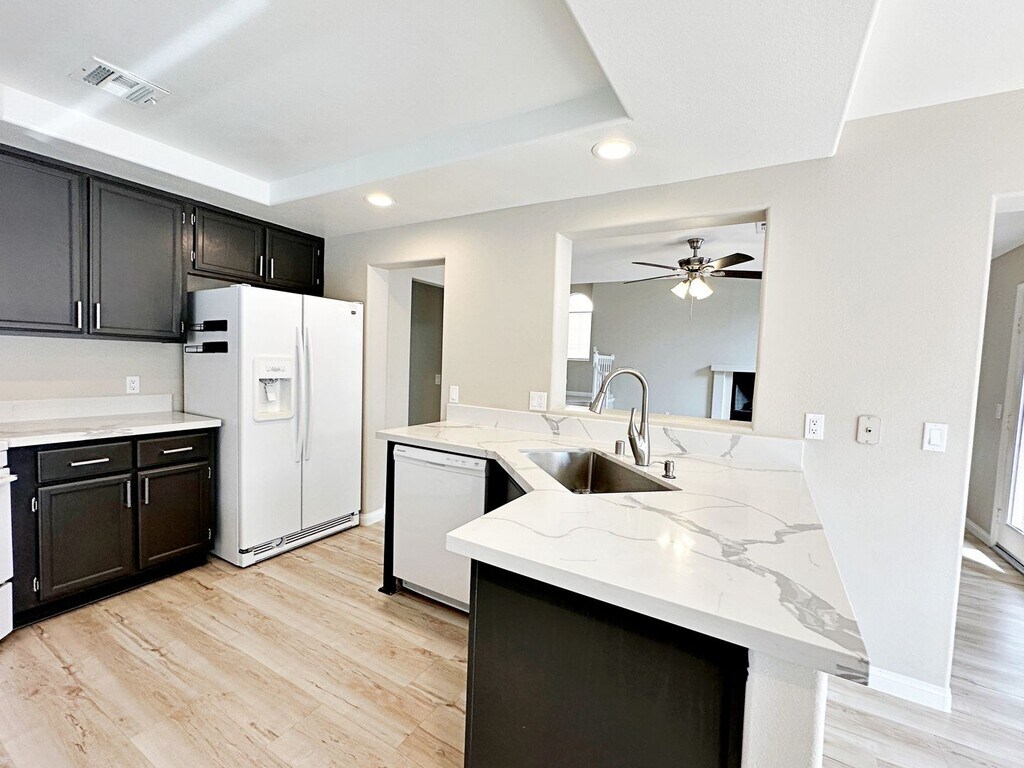 LAMINATE WOOD FLOORING THROUGHOUT ENTIRE HOME* FRESHLY PAINTED INSIDE* NEW AC UNIT* NEW QUARTZ COUNTERTOPS THROUGHOUT KITCHEN AND BATHROOMS* STUNNING MODERN LIGHT FIXTURES* LARGE OPEN LIVING ROOM WITH VAULTED CEILINGS AND GAS FIREPLACE* SEPARATE DINING AREA OFF KITCHEN* TWO ACCESS POINTS TO BACKYARD FROM DINING ROOM + LIVING ROOM* PRIMARY BEDROOM WITH BAY WINDOWS AND WALK IN CLOSET* PRIMARY BATHROOM WITH SEPARATE TUB SHOWER + DUAL VANITY SINK* PRIMARY BATH SHOWER HAS NEW GORGEOUS TILE* OVERSIZED BACKYARD WITH MATURE PINE TREES AND COVERED PATIO* 2 CAR GARAGE WITH WORK BENCH* NEAR LOADS OF SHOPPING AND DINING* EASY OF FREEWAY ACCESS * Rent includes Resident Benefits Package with air-filter delivery and renters insurance, plus rewards, credit reporting, ID protection, and move-in concierge service.