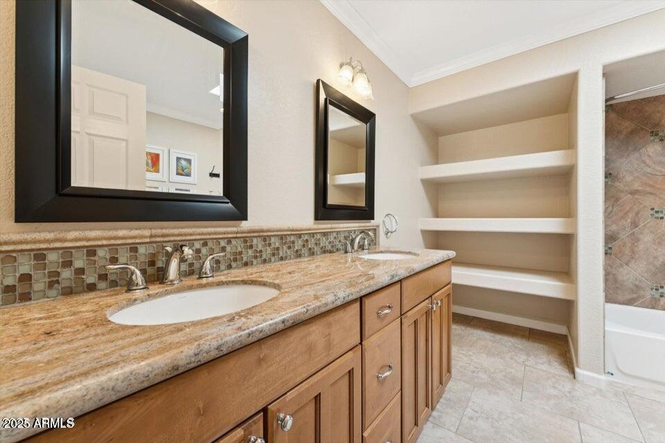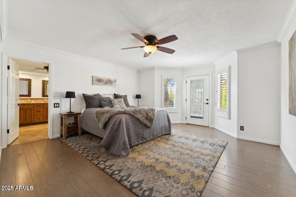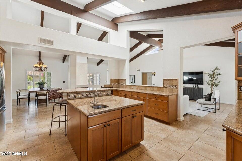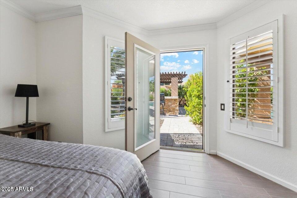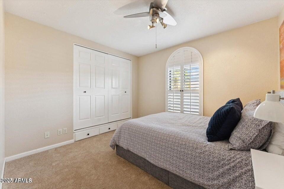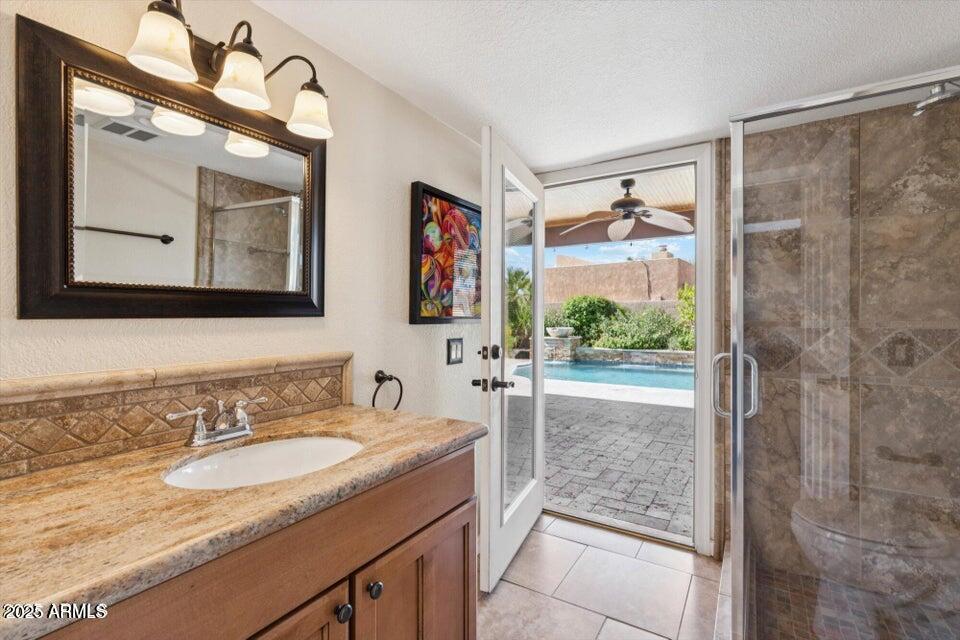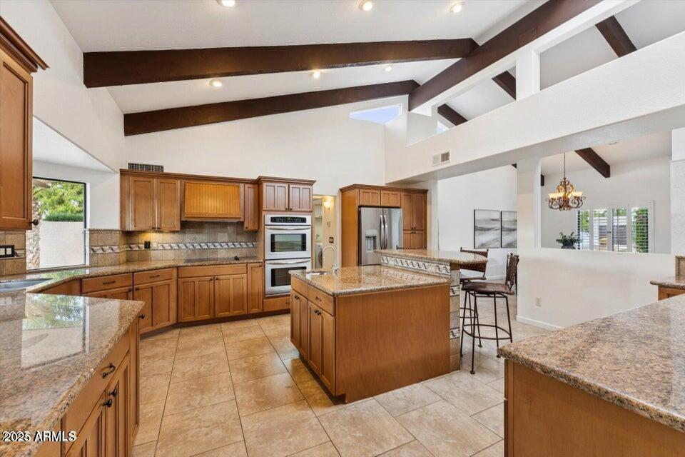 Timeless Spanish Colonial in the Heart of McCormick Ranch! This stunning 4-bedroom,3-bath home perfectly blends classic charm with modern comfort. The open great-room design features vaulted ceilings,a cozy fireplace,and a spacious kitchen with generous counter space. The split fourth bedroom with a full bath provides a private retreat for guests or a convenient home office. French doors lead to a resort-style backyard with lush mature landscaping,a Pebble Tec saltwater pool with water features,a covered patio,and an outdoor kitchen and dining area complete with a built-in BBQ. Owned solar panels,reduce APS costs by 80-90%. Additional upgrades include new HVAC units,a new electrical panel,freshly recoated foam roof,new skylights.
