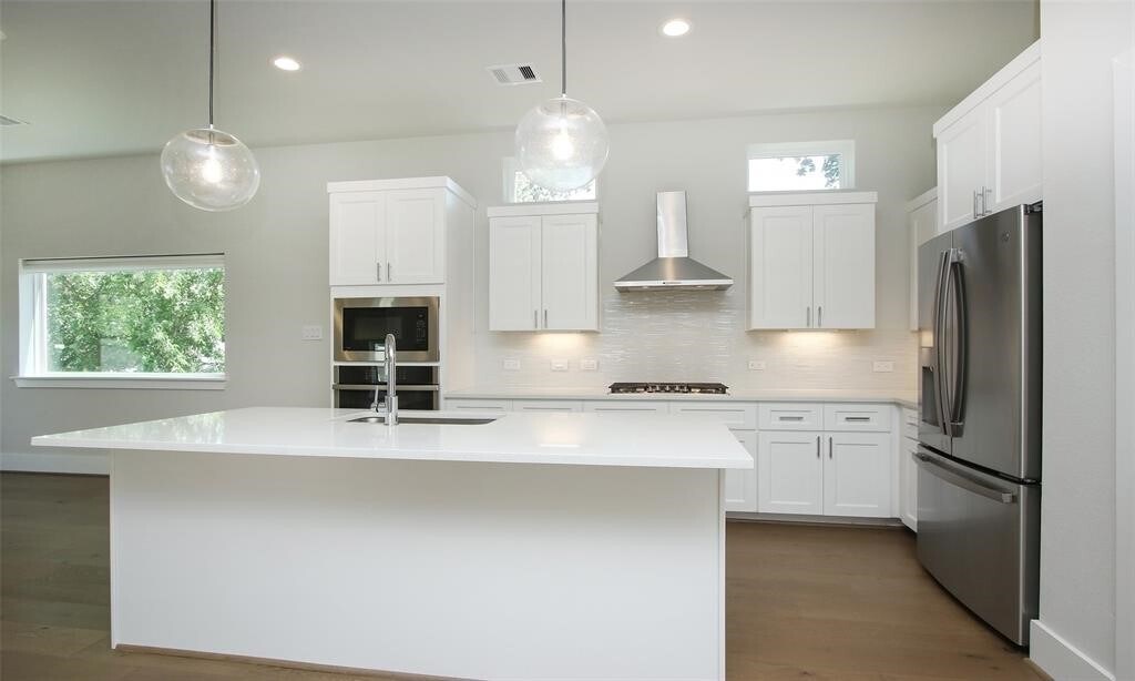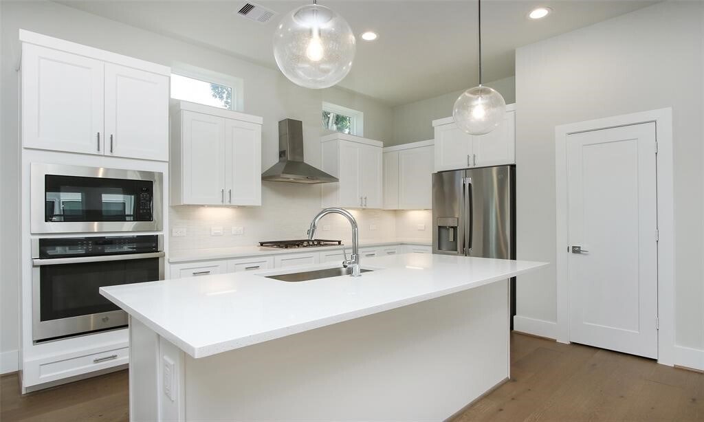 Gorgeous contemporary home located in Garden Oaks. This 3 story home consists of 3 bedrooms and 3.5 baths. Beautiful Oak flooring in common areas,first floor bedroom features a separate entrance and access to private gated backyard. Kitchen features quartz countertops,stainless steel appliances,and a five burner gas range. There is tons of natural lighting pouring in and the high ceilings draw you into the open living/dining area,as well as storage under the stairs. The primary suite is spacious with 2 large closets that have a unique walk through capability with access to primary bath. This home has a two car garage with outdoor storage space. This is an end unit that affords the property to have privacy as well as a backyard (off the 1st floor bedroom) and side yard. MLS# 31575595