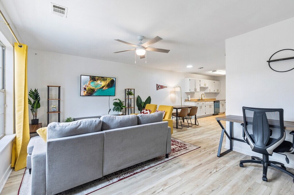 Feel at home in this centrally located property, perfect for large groups and just a 5-minute walk to FSU. This listing combines two 4-bedroom, 3-bath homes, offering a total of 8 bedrooms and 6 bathrooms. Featuring 9 comfy beds and modern decor, this apartment provides all the amenities needed for a comfortable stay. There are two dining rooms, two living rooms with a 50-inch LED 4K Smart TV, and two fully stocked kitchens, allowing you to prepare meals with ease. A smart lock ensures seamless entry, and there is comfortable dining area. There are eight private parking spots available for your convenience. This home is ideally suited for traveling contractors, workers, families, and students, and is located within 2 miles of the Capital Building and downtown. PLACES OF INTEREST: 0.7 miles (5 min drive) - FSU (Florida State University) 2.2 miles (7 min drive) - FAMU (Florida Agricultural and Mechanical University) 2.2 miles (7 min drive) - The Capitol Building 3.2 miles (10 min drive) - Cascades Park 4 miles (12 min drive) - Tallahassee Memorial Hospital To maintain a clean and pleasant environment, there is a strict no-smoking and no-pets policy. The home is not intended for parties, and any indication of unauthorized partying will be promptly reported to local authorities. To ensure a peaceful atmosphere and out of respect for our neighbors, all noise must be kept to a minimum after 10:00 pm.