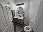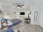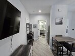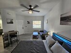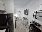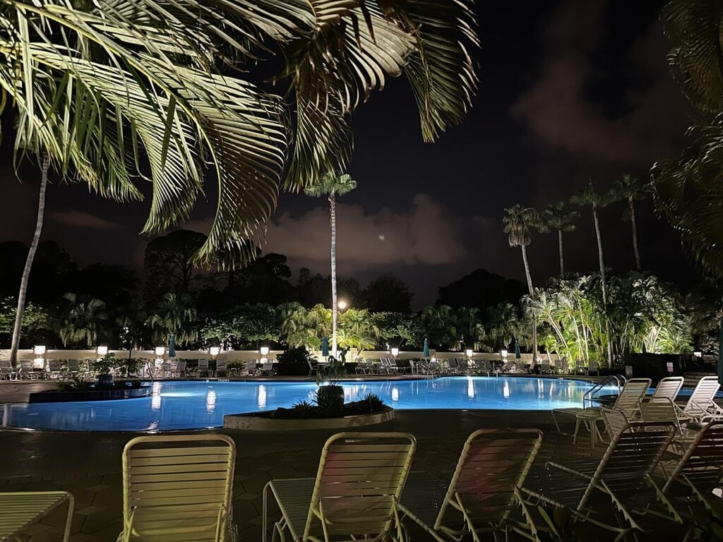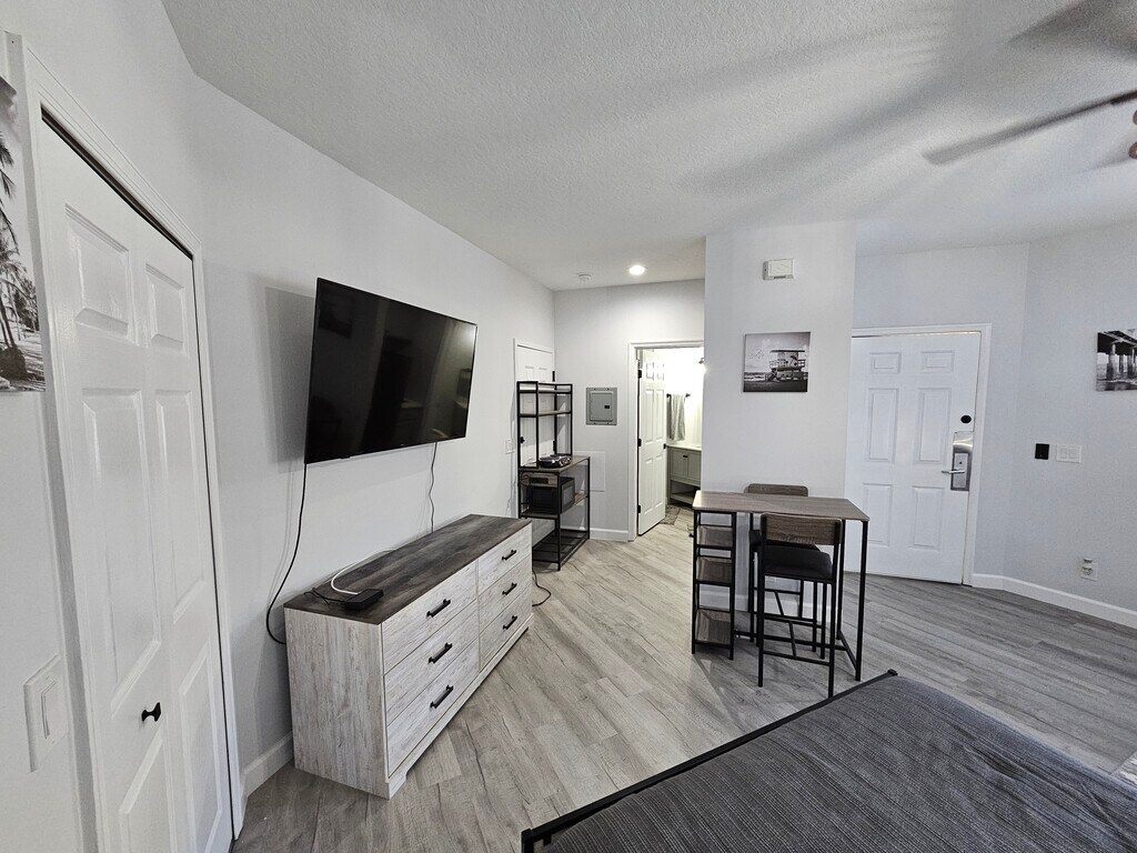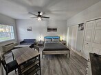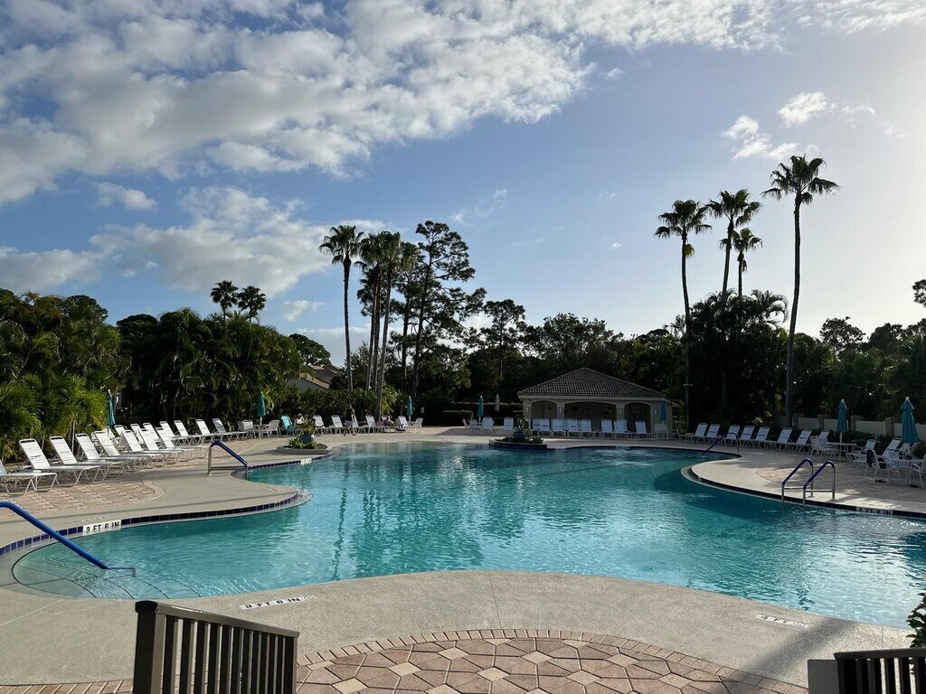 Come see one of the nicest efficiency units in the wonderful gated Castle Pines at PGA Village. This ground floor unit is practically brand new with updated LVP flooring, a new vanity, toilet, plumbing fixtures, quartz counter, black granite sink and even a larger fridge! Back slider leads to an outdoor sitting area with a partial lake view. This efficiency comes fully furnished with a queen sized bed, 58'' Smart TV, love seat, coffee table, 2 night stands, a dresser, a baker's rack with a microwave and 2 burner cooktop and a dining set. New sheets and towels are already there, so you can move right in! Castle Pines offers a resort style heated pool & spa. Unit's location is close to the pool and the community is close to shopping, restaurants and I-95. South Florida Resort style living!