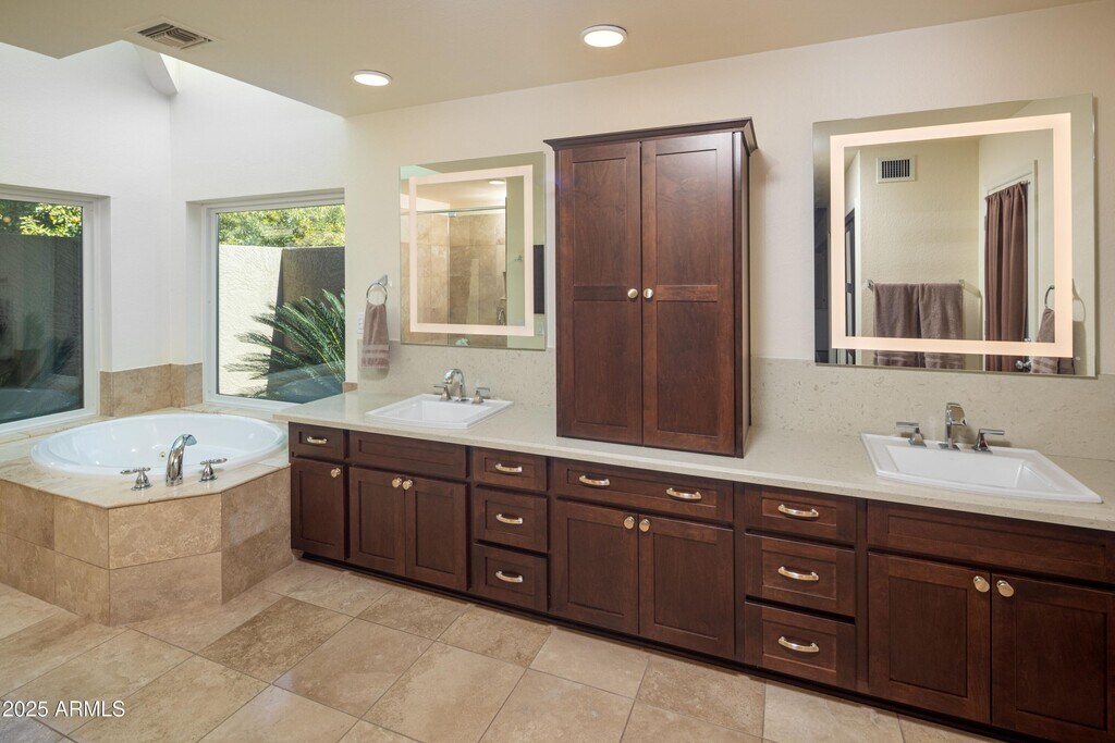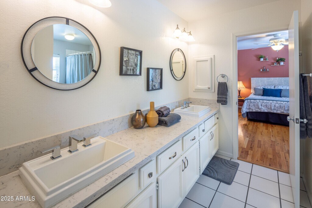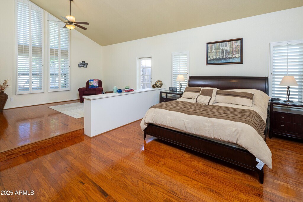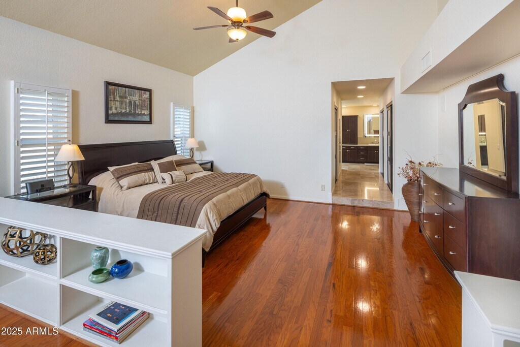 Nestled in one of South Tempe's premier gated communities,this stunning home in Graystone sits on an expansive 0.49-acre lotone of the largest in the neighborhood. The primary suite is located on the first floor and offers a spacious sitting area that perfect for a home office,workout space,or retreat. The en-suite bathroom features a jetted tub,a large walk-in shower,and dual his-and-hers closets. One of the three bedrooms upstairs has an en-suite bathroom while the other two bedrooms share a Jack-n-Jill bathroom. All three bedrooms have walk-in closets. The outdoor space is perfect for entertaining with a saltwater pool that includes 3 water features and color-changeable LED lighting surrounded by mature trees and meticulously maintained landscaping
