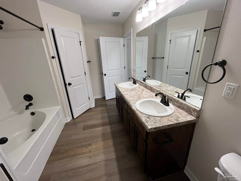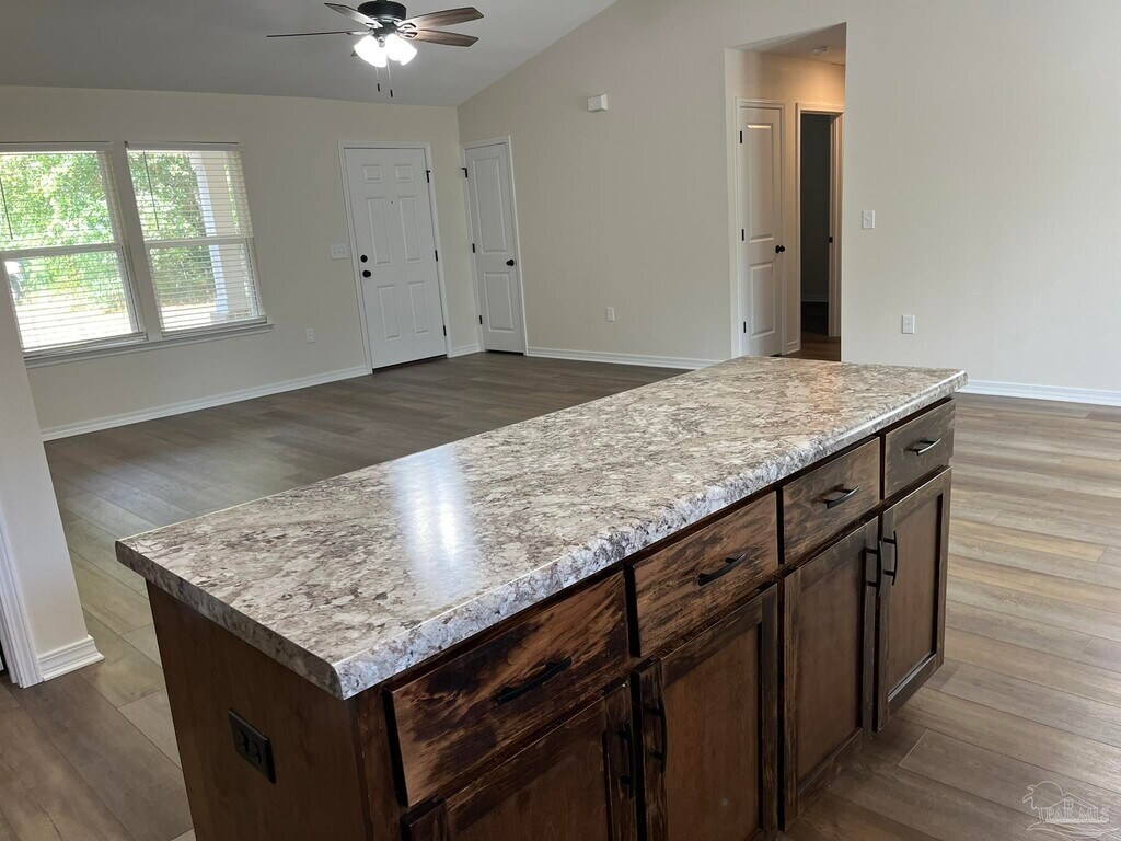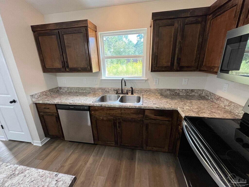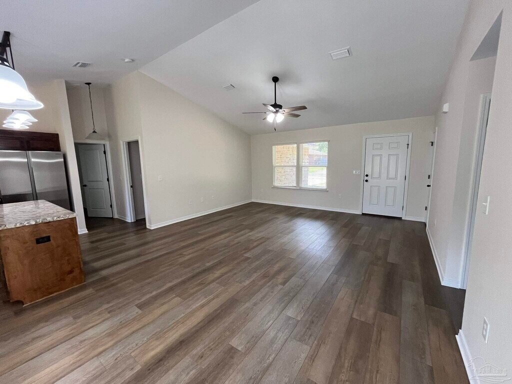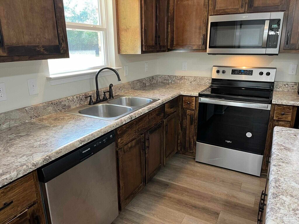 Modern,well-designed home featuring an open-concept layout and split floor plan with a private primary suite and two guest bedrooms. Tucked away at the end of a quiet street,this property offers privacy and tranquility. The living area boasts cathedral ceilings,abundant natural light,and French doors that open to the patio. The kitchen is equipped with stainless steel appliances,an island with storage,and a pantry. The primary suite includes two walk-in closets,a double vanity,and a garden tub/shower combo. Luxury vinyl plank flooring throughout ensures easy maintenance,while matching ceiling fans and ample closet space add to the home’s comfort. Conveniently located just minutes from Navarre Beach and top-rated public schools. Includes washer & dryer.