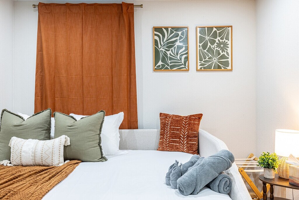 Enjoy a stylish experience at this centrally located Napa Valley retreat. Freshly furnished and thoughtfully designed for comfort and relaxation, this home sleeps up to 6 guests. Feel at home in this cozy space, perfect for extended stays. This retreat includes 2 bedrooms, 1 full bath with a stand-up shower, 1 king-size bed, 1 queen-size bed, and a queen-size sofa bed in the living room. The fully equipped kitchen includes cookware, utensils, a dining table that seats 6, a fridge and freezer, oven, microwave, dishwasher, toaster, coffee maker, electric kettle, Instant Pot, and blender. Relax in the private backyard with a fire pit, hammock, outdoor seating, a BBQ grill, jumbo Connect 4, and a putting green mat. For entertainment, there is a 65” Smart TV with streaming and live TV, cozy sofa seating, an accent chair, a coffee table, and a bar cart with a full bar set. Games for all ages are provided, including UNO, Scramble, Trouble, Connect 4, Sorry, Monopoly, Tic Tac Toe/Chess/Checkers, and playing cards. There is also a washer and dryer available for use. A pack 'n Play, high chair, baby bathtub, extra linens and blankets, kids books, magnet tiles, plushies, a textured ball set, and dino toys are available for families. Located near hospitals, airports, and major work hubs for easy commuting, this home is also close to world-renowned wineries, tasting rooms, downtown dining, and scenic Napa Valley attractions. It's just minutes from downtown tasting rooms, the Wine Train, Oxbow Public Market, and world-class restaurants. Nearby attractions include Oxbow Public Market (0.7 mi), CIA at Copia (0.8 mi), Napa Valley Wine Train (0.8–1 mi), Downtown Napa/Riverfront (1 mi), and Napa Valley Expo (1 mi). To access the bathroom, bedroom 1 guests must walk through bedroom 2. The home is located on a semi-busy street, so you may occasionally hear cars as they pass by. Additionally, the Napa Valley Wine Train runs throughout the day, sometimes even as late as 9 PM, and you can hear it as it goes by. The home includes a 2-car driveway with back-to-back parking and additional street parking. Also included are a washer and dryer with starter detergent/pods, an iron, ironing board, steamer, extra linens, blankets, pillows, smoke detectors, CO detectors, and fire extinguishers. [SI]