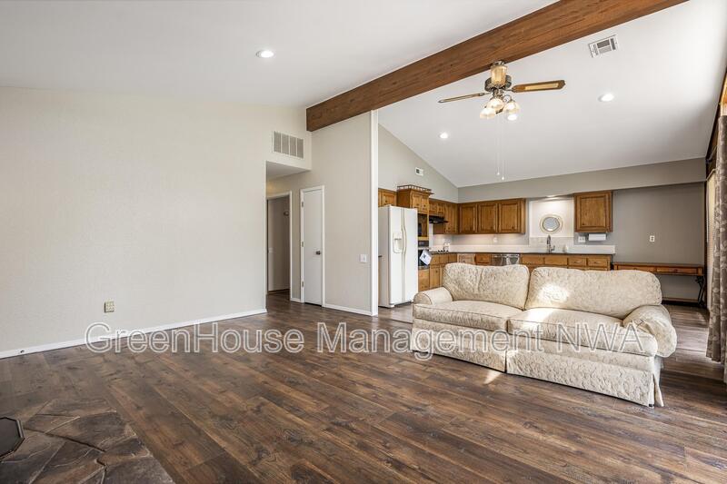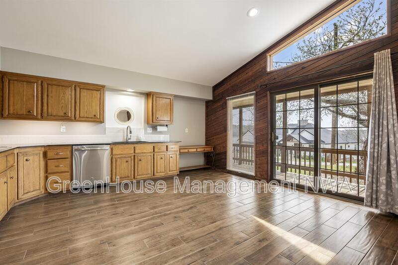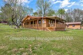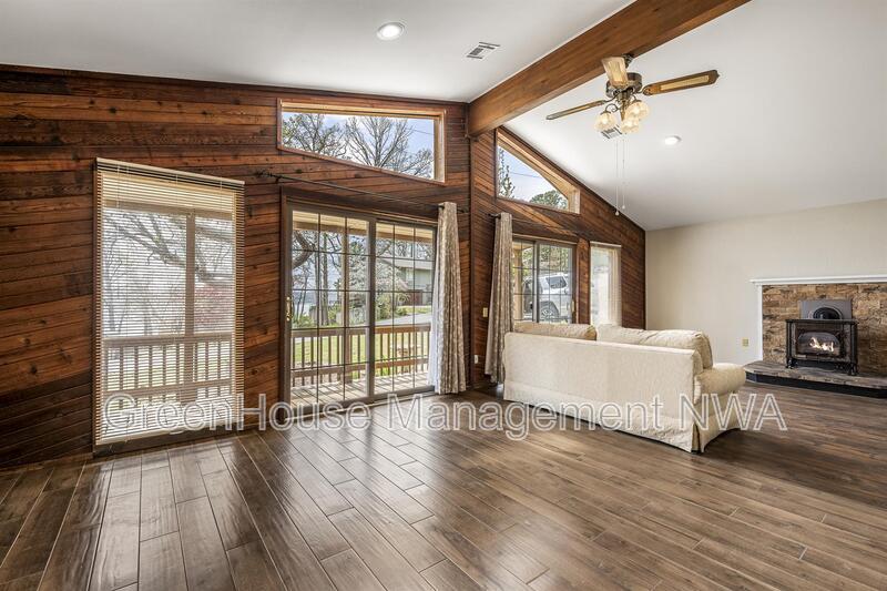 Charming lake-area home located at 8392 S Lakeshore Dr in Rogers, just minutes from Beaver Lake. This well-maintained 3 bedroom, 2 bathroom home offers a comfortable layout with a spacious living area, vaulted ceilings, and abundant natural light. The interior features warm wood accents, durable flooring throughout main areas, and a cozy wood-burning fireplace that adds character to the living space. The kitchen provides ample cabinet storage, functional workspace, and a connected dining area ideal for everyday living. Bedrooms are well-sized with a mix of updated flooring and comfortable finishes. Enjoy outdoor living with a large covered front porch and elevated deck space, perfect for relaxing or taking in seasonal lake views. The property sits on a generous lot with mature trees, offering privacy and a peaceful setting. Located in a quiet area near Beaver Shores with convenient access to Rogers, dining, and outdoor recreation.