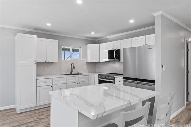 Gorgeously Renovated Makaha Home Welcome to this beautifully renovated 3-bedroom, 1.5-bath detached single-family home on the desirable Manuku Street in Makaha. Recently updated from top to bottom, this home offers a bright and open living and dining area centered around a modern kitchen island. The kitchen has been upgraded with white quartz countertops, while luxury vinyl plank flooring runs throughout the main living areas, bedrooms, and half bath. The main bathroom showcases ceramic tile flooring, a new vanity and cabinetry, and a stunning floor-to-ceiling tiled shower with all-new fixtures. Both bathrooms and the kitchen have been refreshed with stylish, modern finishes. Additional highlights include recessed lighting, a newly installed split A/C system, fresh interior and exterior paint, and brand-new vinyl windows designed to keep the home cool and energy efficient. Located just minutes from world-famous Makaha Beach, Aki’s Beach, and the breathtaking Yokohama Bay.