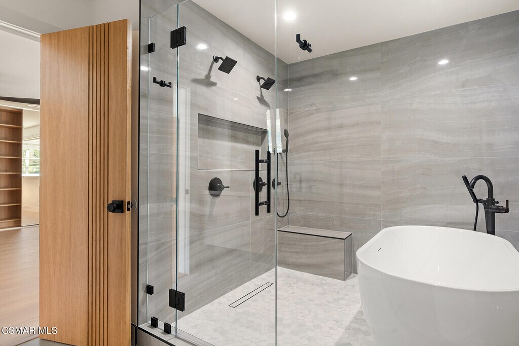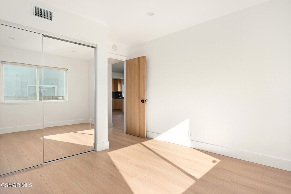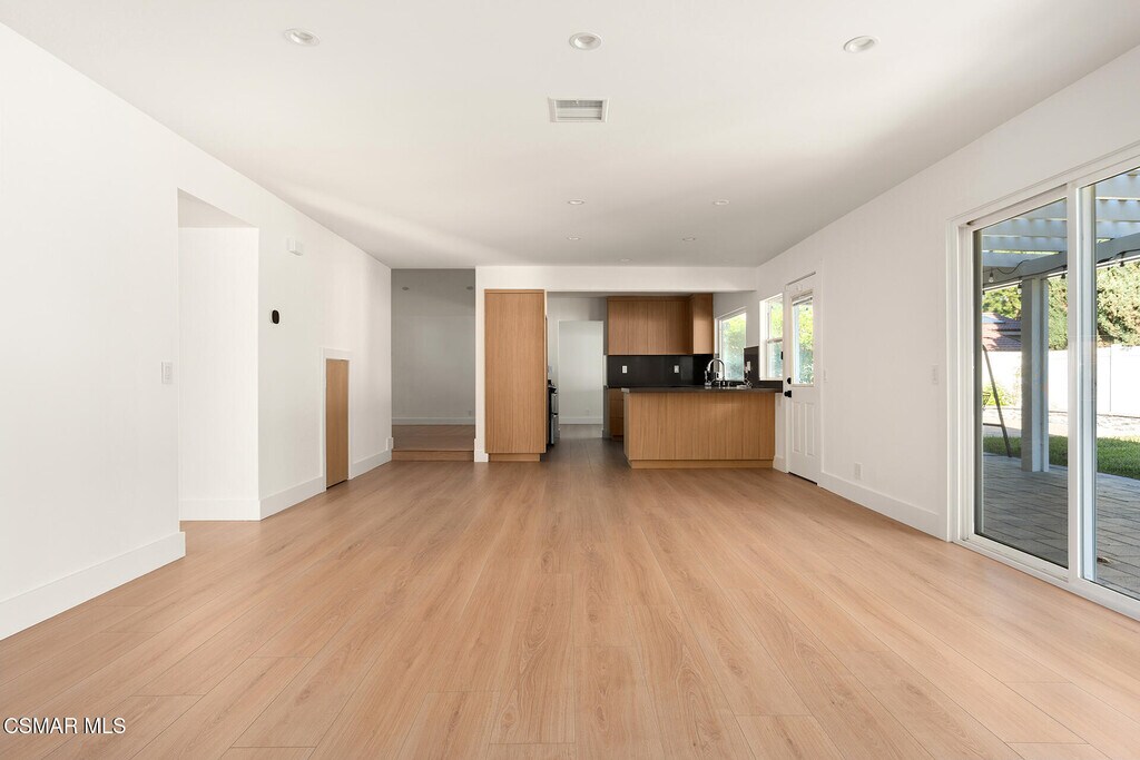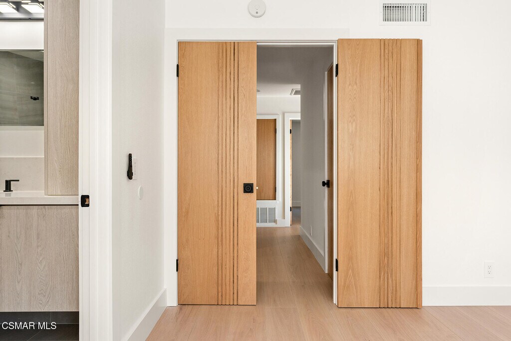 Modern design meets effortless comfort in this expansive 5-bed, 3-bath residence offering 2,399 sq ft of stylish living on a beautifully designed 6,098 sq ft lot. Every space reflects a refined, elevated aesthetic--wide-plank French-oak style flooring, smooth ceilings, curated lighting, and contemporary fixtures create a cohesive, luxury feel throughout the home.The main level features an open layout perfect for both daily living and entertaining. A spacious formal living and dining area is anchored by a custom-built-in buffet with abundant storage--ideal for gatherings and displaying your favorite pieces. The kitchen blends clean lines with thoughtful storage, including custom cabinetry, quartz counters, and efficient organization throughout. The layout allows room for a full-size refrigerator and opens seamlessly to the expansive family room, offering plenty of space for casual dining, conversation seating, or both. Additional storage is thoughtfully tucked beneath the staircase.A private first-floor bedroom and full bathroom with a generous walk-in shower and floating vanity provide flexibility for guests, a home office, or multi-generational living.Upstairs, the serene primary suite offers two closets--one wall-to-wall system with soft-close sliding panels and integrated organization, plus a second closet designed for longer garments and added storage. The en-suite bath features a full wet-room experience with a spacious walk-in shower, two shower heads, and a soaking tub positioned within the same enclosure. A floating vanity and dedicated storage cabinet complete the clean, contemporary design.Three additional bedrooms complete the second level, two featuring the same custom closet organization, including one full walk-in closet. The hall bathroom continues the aesthetic with modern tilework, floating vanity design, and dark, architectural hardware.The three-car garage offers epoxy flooring and a modern garage door with a wall-mounted motor system, maximizing clearance for taller vehicles and creating a streamlined look.Designed for low-maintenance enjoyment, the exterior features attractive hardscaping with pavers, a built-in BBQ, two covered patio areas, and turf in the front yard for year-round curb appeal.