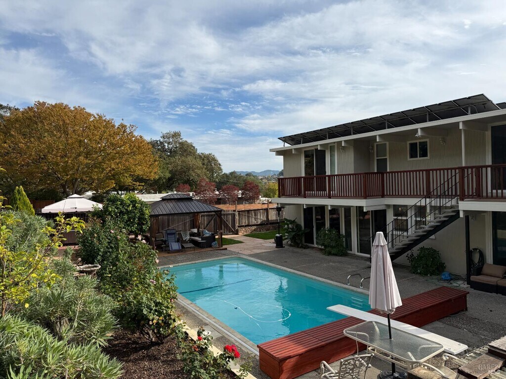 Remodeled Eichler in one-of-a-kind setting and location adjacent open space. Downstairs 4 bedrooms, 2 bathroom approx 1850 square feet is available for rent. Recently renovated kitchen with large island and slider to backyard oasis. Vacation at home with pool, hot tub, outdoor shower, multiple sitting areas with hillside views and convenient access to open space. Truly a one of a kind setting in highly sought after Lower Lucas Valley location. All new carpet and flooring, freshly painted, internet, gardener, pool and hot tub maintenance all included. MLS#325099044