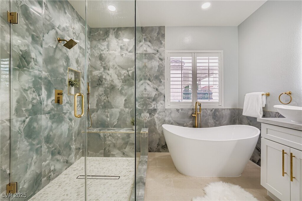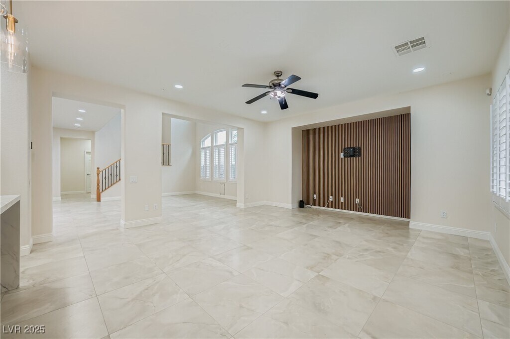 Located in The Paseos in Summerlin, this beautiful remodeled home features a kitchen with quartz countertops and island; all kitchen appliances are included in the lease. Washer/dryer included as well. The home has shutters throughout and is move-in ready. Outside has a large covered patio and a pool/spa. Pool Service and Landscaping included in the rental price.