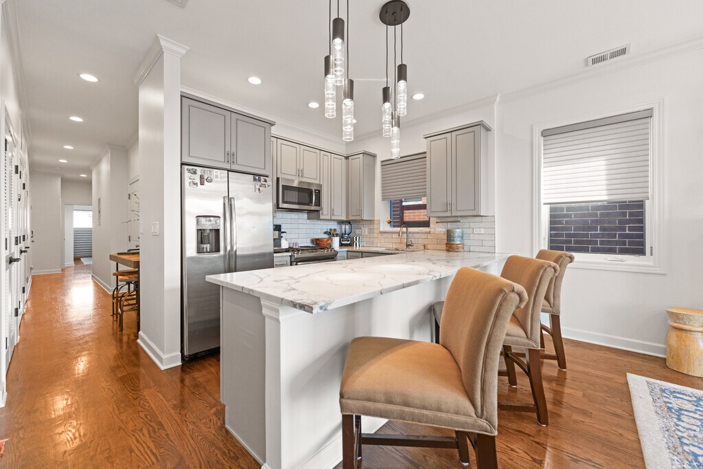 Experience Modern Elegance in this beautifully remodeled 2-bed,2-bath penthouse in River West,perfectly situated near the vibrant Randolph Street Restaurant Row,Fulton Market,West Loop,and River North,with effortless access to highways and public transit. This penthouse boasts two outdoor spaces,including a newly constructed,500 SF PRIVATE rooftop deck offering breathtaking skyline views. Recent upgrades include a full roof replacement using premium materials and the addition of a stunning composite-wood roof deck with a pergola-ideal for both entertaining and relaxation. Further enhancements feature refinished hardwood floors,fresh paint,new moldings,designer light fixtures,and matte black hardware throughout. The primary bedroom features a custom walk-in closet and a private balcony. The ensuite bathroom provides a spa-like retreat with quartz countertops,a dual vanity,and a walk-in glass shower. This home is outfitted with state-of-the-art smart home technology,including a Nest thermostat,smart lighting,and a keyless entry system,providing seamless control and convenience. Additional highlights include energy-efficient windows and an open-concept layout that maximizes space,allowing for a smooth flow from the living area to the outdoor spaces. The property includes a 1.5-car garage space in the price,making it as practical as it is beautiful. MLS# MRD12628188 Based on information submitted to the MLS GRID as of [see last changed date above]. All data is obtained from various sources and may not have been verified by broker or MLS GRID. Supplied Open House Information is subject to change without notice. All information should be independently reviewed and verified for accuracy. Properties may or may not be listed by the office/agent presenting the information. Some IDX listings have been excluded from this website. Prices displayed on all Sold listings are the Last Known Listing Price and may not be the actual selling price.