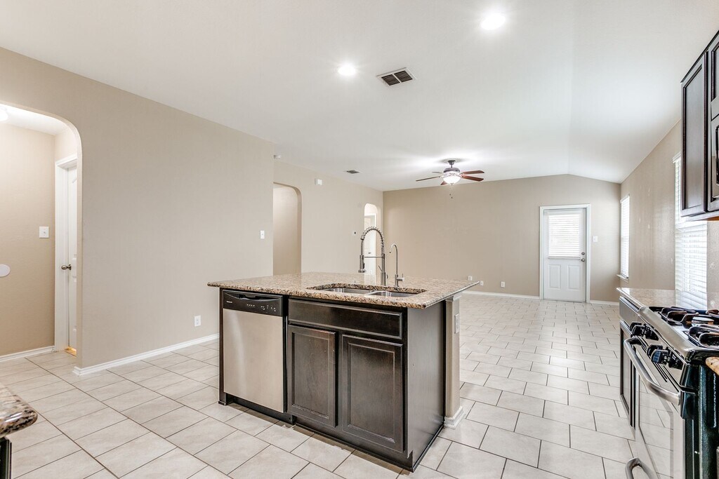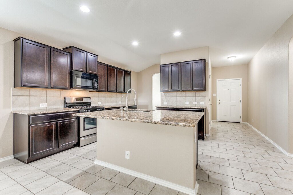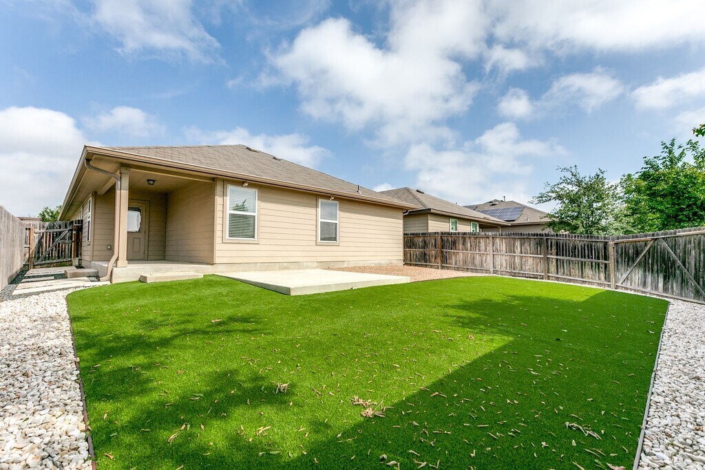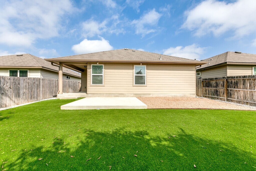 This beautifully maintained single-story home offers 3 bedrooms and 2 bathrooms, featuring a separate dining area and an eat-in kitchen. The open-concept floor plan is highlighted by tile flooring throughout all living and wet areas, creating a bright and inviting living space. The stunning kitchen showcases granite countertops, a large center island, stainless steel appliances, and gas cooking—perfect for entertaining and everyday living. Enjoy outdoor living year-round in the private backyard backing up to a green space, complete with lush landscaping, turf, and a covered patio ideal for gatherings. The home also boasts excellent curb appeal with an extended driveway, and a full sprinkler system. Conveniently located near shopping, restaurants, SeaWorld, Lackland AFB, easy major highway access, and highly rated schools, this home offers both comfort and convenience in a desirable community.