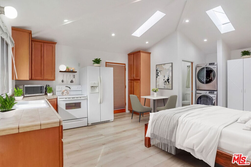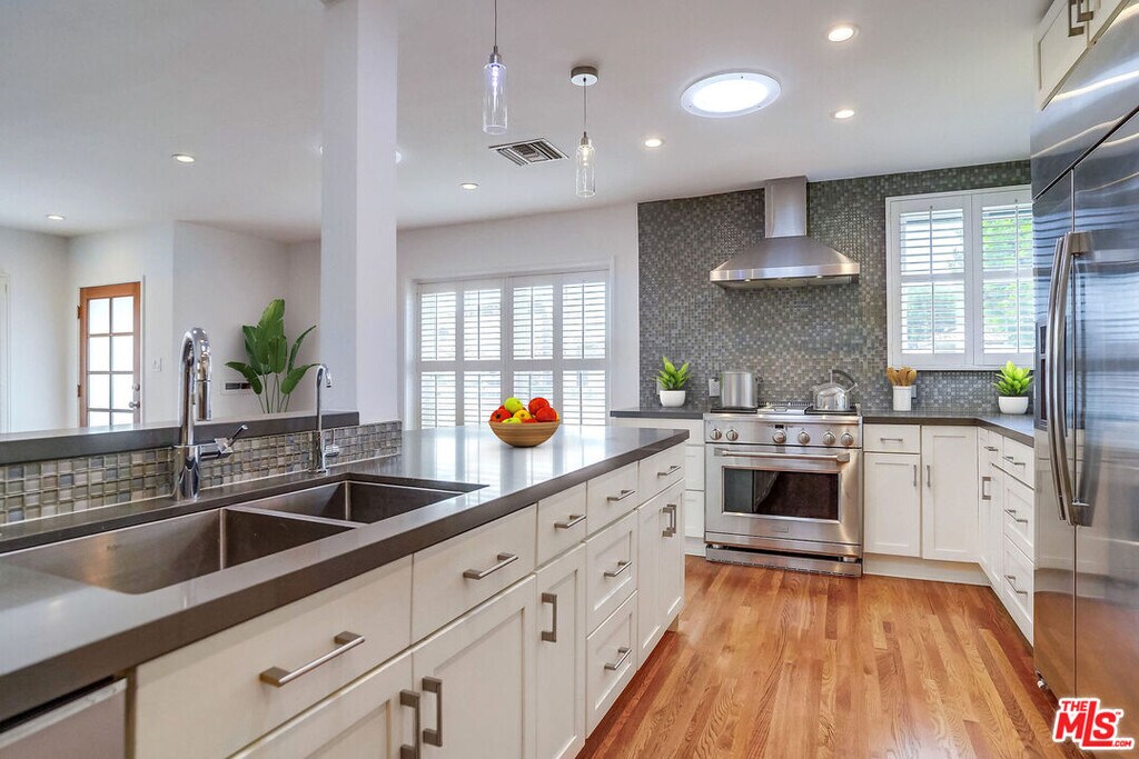 Beautifully remodeled 3-bedroom, 3-bathroom home for lease in Loyola Village. The third bedroom is located separate from the main house at the back of the property in a fully remodeled ADU featuring a vaulted ceiling with skylights and a complete full kitchen (refrigerator, dishwasher, oven/range, stackable washer/dryer). French doors open onto a semi-private courtyard. The main house is bright, spacious, gorgeously maintained open-concept residence with refinished hardwood floors and recessed lighting throughout. The living room, with fireplace and plantation shutters, and a dining space adjoin the contemporary chef's kitchen featuring quartz countertops, tile backsplash, loads of cabinets, and stainless steel appliances (refrigerator, oven/range, dishwasher, microwave, stackable washer/dryer). The wine fridge fits perfectly beneath the breakfast bar. The expansive primary bedroom features a walk-in closet and remodeled ensuite bath with stall shower and tub. The second bedroom is equally roomy and includes lots of closet space and a door to the back patio. Oversized 2-car garage with a large storage area sits next to the ADU at the end of a long, gated driveway. MLS# 26667675