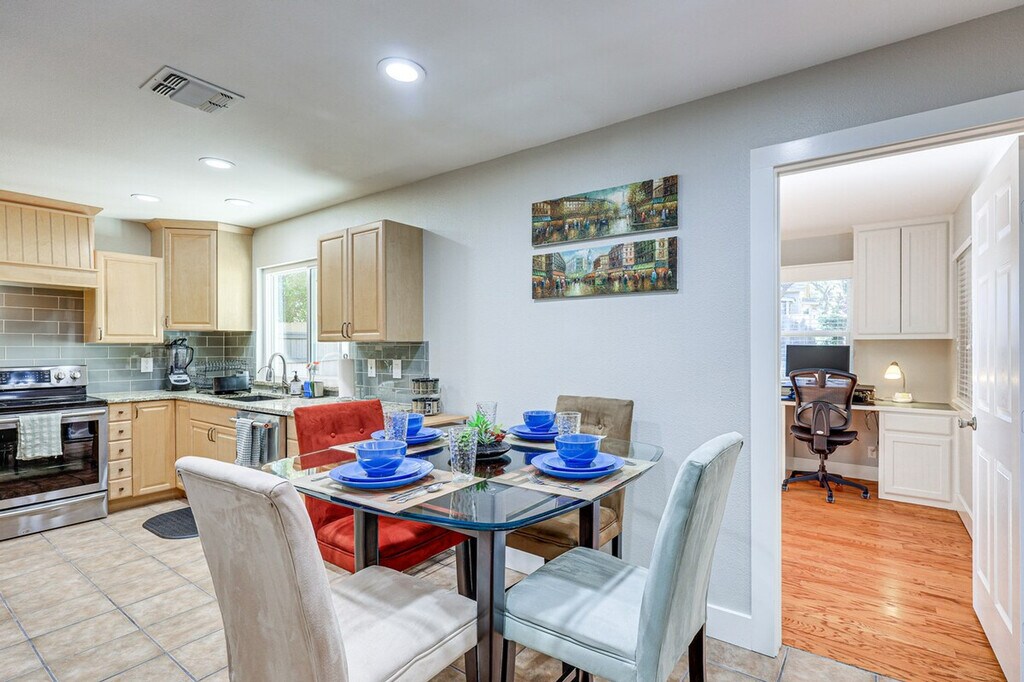 Feel at home in this 3-bedroom, 2-bath San Antonio vacation rental, offering the ideal mix of comfort, convenience, and outdoor adventure in a quiet area. This single-story home requires 2 steps to enter the front door, though no steps are required to enter through the garage. An additional step is required to access the living room and kitchen. This home features smart TVs, Amazon Fire TV Sticks, blackout/noise reduction curtains and a sound machine in each bedroom, an en-suite bathroom, a patio with a gas grill, picnic table and seating, and a fenced backyard. The well-stocked kitchen includes a stove/oven, refrigerator, dishwasher, microwave, toaster, air fryer, blender, Keurig coffee maker (starter coffee provided), water kettle, cooking and baking basics, dishware/flatware, storage containers, starter trash bags/paper towels, and a reverse osmosis water filtration system. You'll also find free Google Fiber Wi-Fi (1 GB), central air conditioning/heat, linens/towels, a hair dryer, starter toiletries, a washer/dryer, starter laundry detergent, an iron/board, a Shark vacuum, a Roomba vacuum, brooms, mop, and cleaning supplies. Keyless entry and a keypad on each bedroom door are provided. EV charging is provided with a fee; please reach out to the Guest Contact for more information. This home offers direct access to multiple trails connecting to the greenway systems and is 1 mile to grocery, retail, parks, and medical facilities. Enjoy the Braun Station East community amenities, including an outdoor pool, tennis court, pickleball court, basketball court, playground, and a clubhouse (available to rent upon request). Quiet hours are from 10:00 PM to 8:00 AM. This property features 3 exterior security cameras: 1 camera is located above the back door facing the backyard and patio, 1 camera is located in the doorbell facing the front yard, walkway, and street, and 1 camera is located above the garage door facing the driveway and street. The cameras are outward facing and do not look into interior spaces and will record video and sound when activated by motion. Includes a designated workspace with a monitor. Guests will have access to the entire property via keyless entry. [SI]