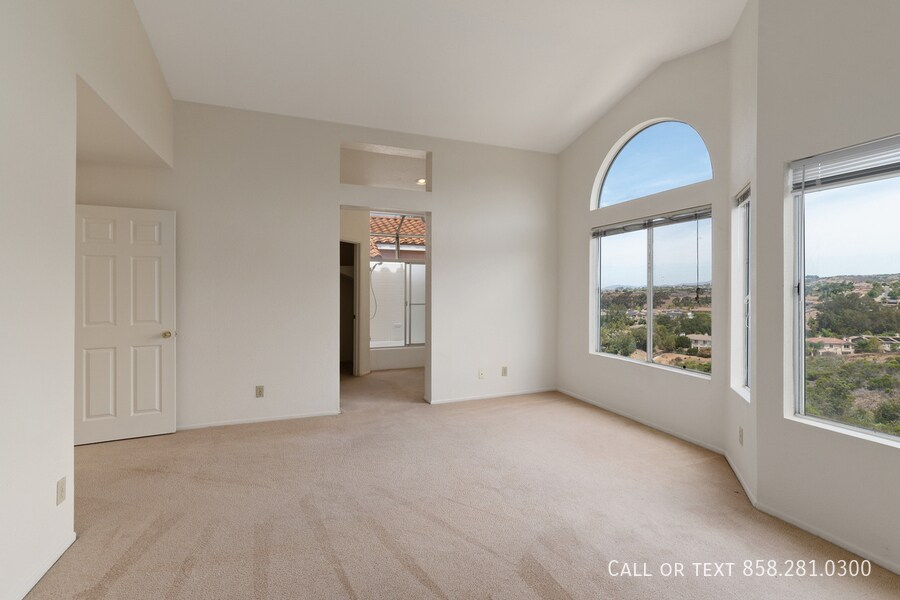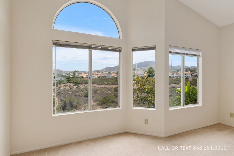 Beautiful 4-bedroom 3-bath home with canyon views in the highly desirable Crestmont neighborhood. The entryway opens to the living room with soaring vaulted ceilings. A cozy fireplace enhances the spacious family room, which leads to an entertainer's delight, a private backyard facing the canyon. Views are never-ending, and Black Mountain creates the perfect backdrop. Upstairs, what more can you ask for than a grand master bedroom with vaulted ceilings and panoramic canyon views. A dual sink vanity and your own walk-in closet are featured in the spacious master bathroom. Two hallway bedrooms, a full hallway bathroom, and built-in hallway cabinets round out the upstairs accommodations. Downstairs you'll also find new rich wood-look flooring and a bedroom and full bathroom with shower! Ideal location within close proximity to three levels of schools in award-winning Poway Unified School District. Close access to highways 56, 15, and 5 connections, yet situated in a quiet and serene cul-de-sac. Shopping just minutes away in Rancho Penasquitos Towne Center with Vons, CVS, Starbucks, restaurants, post office, and more.