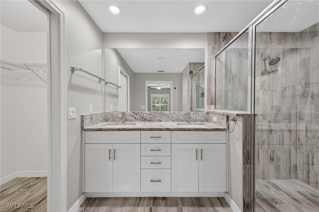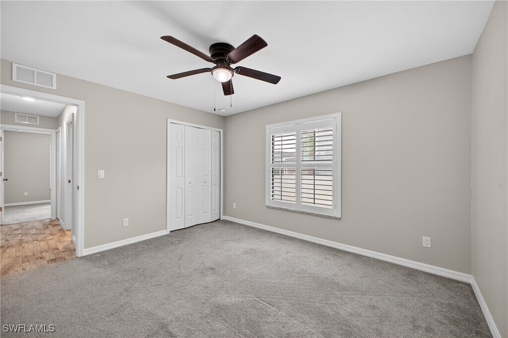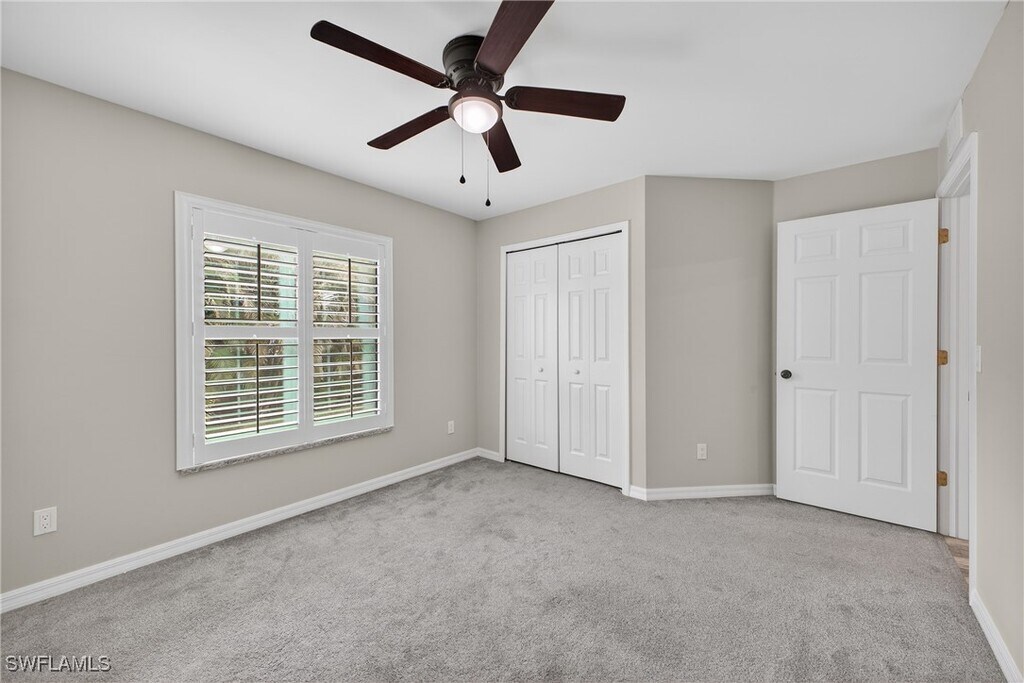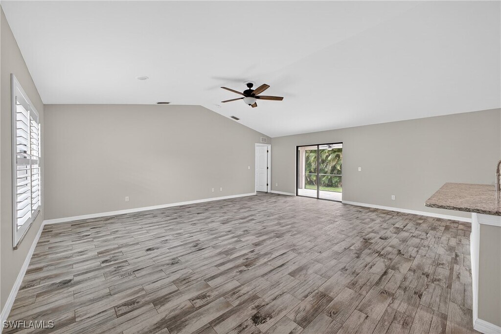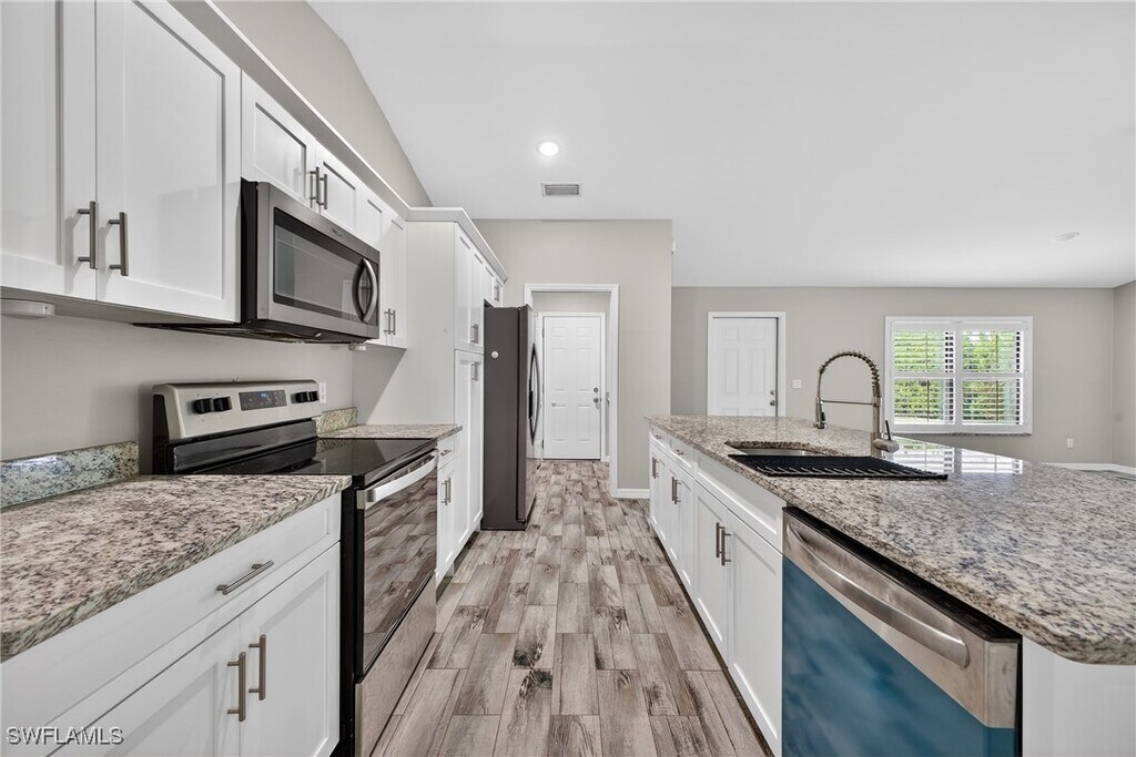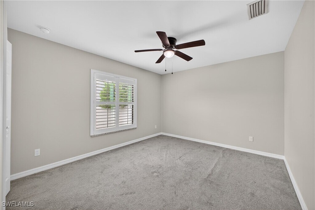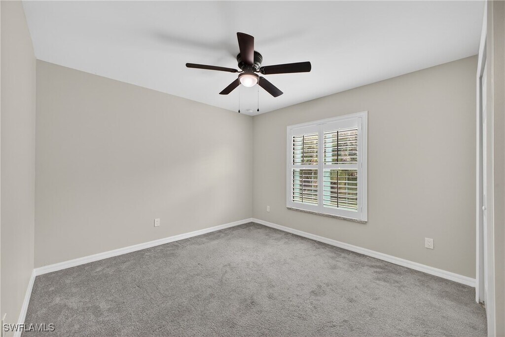 This 4-bedroom,2-bath single-family home is available for rent and offers approximately 1,700 sq. ft. of living space. It is conveniently located in San Carlos Park,just minutes from FGCU,Southwest Florida International Airport (RSW),Gulf Coast Town Center,and I-75. The home features a desirable split-floor plan,ideal for families. Tile flooring throughout the main living areas complements the carpeted bedrooms for added comfort. The kitchen features white shaker cabinets,granite countertops,and stainless steel appliances. The primary suite includes an en-suite bathroom with dual sinks,a large walk-in shower,and a walk-in closet. Additional highlights include an indoor laundry room with storage cabinets and a granite folding counter,as well as a covered under-truss lanai—perfect for entertaining or enjoying your morning coffee. The fully fenced property provides added privacy. With a functional layout,modern finishes,and a prime location,this home is an excellent place to call home.