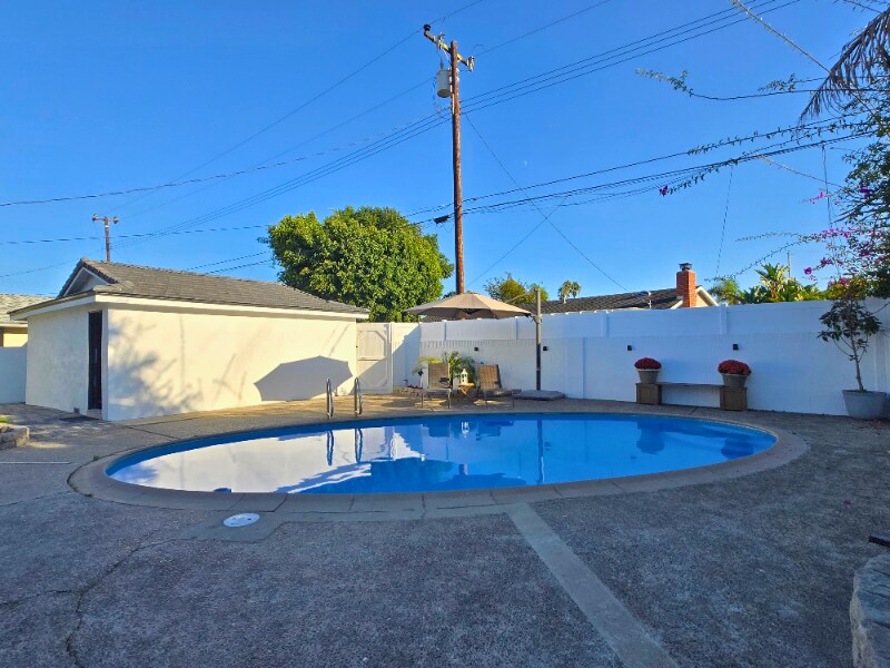 Property Id: 2188930 This completely renovated, single-story home blends relaxed California living with thoughtful, high-end design. With 4 bedrooms and 2 bathrooms, it's designed to be both functional and comfortable, and sits on a generous lot with a private in-ground pool, detached two-car garage, and both front and backyards. Inside, each of the four bedrooms has a queen-size bed and its own closet. One of the bedrooms also has a work desk, perfect if you're working remotely or just need a place to set up your laptop. The primary bedroom has its own en suite bathroom with a walk-in shower. The second bathroom, also with a walk-in shower, is easily accessible from the rest of the home. The living room includes a smart TV and flows into a dining area and a fully equipped kitchen that has everything you need to cook at home. Whether you're warming up leftovers or hosting a meal, it's all ready to go. Laundry is located in a utility closet on the patio, tucked away but easy to get to.