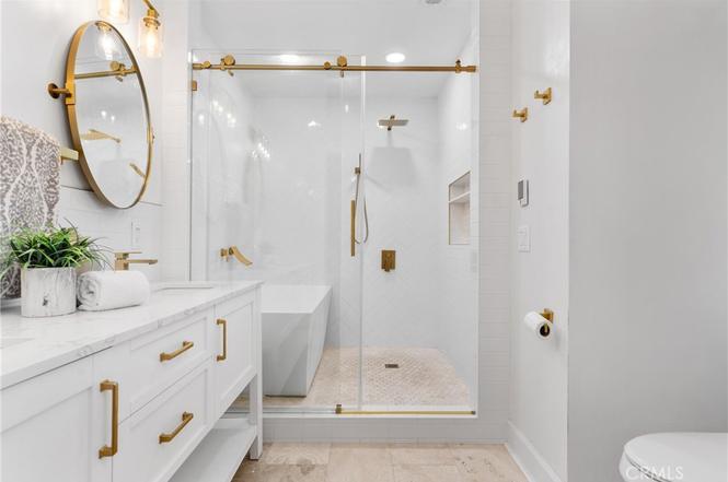 REMODELED 1913 ROSE PARK HISTORIC DISTRICT BUNGALOW. You'll fall in love, starting with the country-style front porch, and the OPEN CONCEPT LIVING SPACE abundant with natural light. The Fully REMODELED kitchen features a large EAT-IN ISLAND with room for 5, QUARTZ COUNTERTOPS, SOFT CLOSE CABINETS and DRAWERS, STAINLESS STEEL APPLIANCES including a 5-BURNER STOVE, REFRIGERATOR, DISHWASHER, and WINE FRIDGE. Plus EXTRA COUNTER SPACE, Cabinets, and a SECOND SINK, perfect for entertaining. The spacious PRIMARY Suite has a CEDAR WOOD WALK-IN CLOSET, a Bathroom with HEATED FLOORS, a DOUBLE SINK VANITY, and a WALK-IN SHOWER with a SOAKING TUB inside. Bathroom number two has also been updated and is adjacent to the secondary bedroom and common area. If OUTDOOR ENTERTAINING and RELAXING is your thing you'll be WOWED by the ENCHANTING BACKYARD. Accessible from both the kitchen and primary suite, This EXPANSIVE SPACE Features a Large WOOD DECK, BUILT-IN BBQ, OUTDOOR TV, charming BRICK PATIO, FIRE PIT, and LUSH MATURE TREES creating the ultimate OUTDOOR RETREAT. Towards the rear of the property, you'll find a STUDIO CASITA Bonus Space with UPDATED FLOORING, KITCHEN, and BATHROOM complete with a SHOWER and MODERN VANITY. This home offers convenient access to parks, schools, restaurants, coffee shops, and the beach.