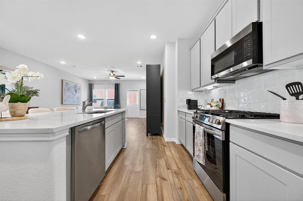 This stunning two-story home features 5 bedrooms,3.5 baths,and an open-concept layout designed for modern living. The primary suite is conveniently located on the first floor,while upstairs offers four additional bedrooms,two full baths,and a spacious game room,perfect for family or guests. The gourmet island kitchen includes upgraded countertops,under-cabinet lighting,a stylish backsplash,and a tankless water heater for efficiency. Additional highlights include luxury vinyl plank flooring,a mud bench,covered patio,irrigation system. Ideally situated just minutes from The Woodlands,this home combines the tranquility of a peaceful neighborhood with close proximity to shopping,dining and parks. MLS# 51971286