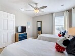 Feel at home in "The Calabay Retreat," a beautifully designed 2830 sq. ft. villa that combines sophistication, comfort, and convenience. This home is perfect for families and groups of up to 10. The bright and inviting living room offers ample seating with two plush sofas and a cozy armchair, along with a Smart TV equipped with Spectrum Cable. Adjacent to the living space, you’ll find a formal 6-seat dining table, a 4-seat breakfast nook, and a 3-seat bar. The fully equipped kitchen features modern appliances, granite countertops, and all the tools you need. The game room is complete with a pool table, foosball, and air hockey. Included amenities are fresh linens and towels, a washer and dryer, a fully stocked starter pack with essentials, a Pack-n-Play, high chair, strollers, outdoor patio furniture, and an electric BBQ grill. Pool heat is available for $40/day. Mid-stay cleaning is available for an additional fee. Located in Calabay Park, you’re just a short 30-minute drive from Walt Disney World, with other attractions like Universal Studios, SeaWorld, and Island H2O Live! within easy reach. Nearby grocery stores and shopping centers ensure all your needs are met during your stay. No parties, pets, or smoking are allowed. Quiet hours are between 9 PM and 8 AM, and non-compliance may result in fees or eviction. Check-in is at 4:00 PM, and check-out is at 10:00 AM. Enjoy a seamless self-check-in with a smart lock and timely email instructions. The loft area includes a dedicated workspace, and free high-speed Wi-Fi ensures you can stay connected during your stay. This home provides a serene escape with five bedrooms across two floors: First Floor: A king-size suite and queen-size suite, each with their own en-suite bathrooms for ultimate privacy. Second Floor: A king-size suite and two twin bedrooms share a hall bathroom. All bedrooms are equipped with Smart TVs for entertainment and cozy bedding for restful nights. Step outside to your private screened-in patio featuring a sparkling swimming pool and spillover spa. With outdoor seating and dining space, it’s the perfect spot to soak up the Florida sunshine. Note that pool heating may be limited in colder weather. [SI]