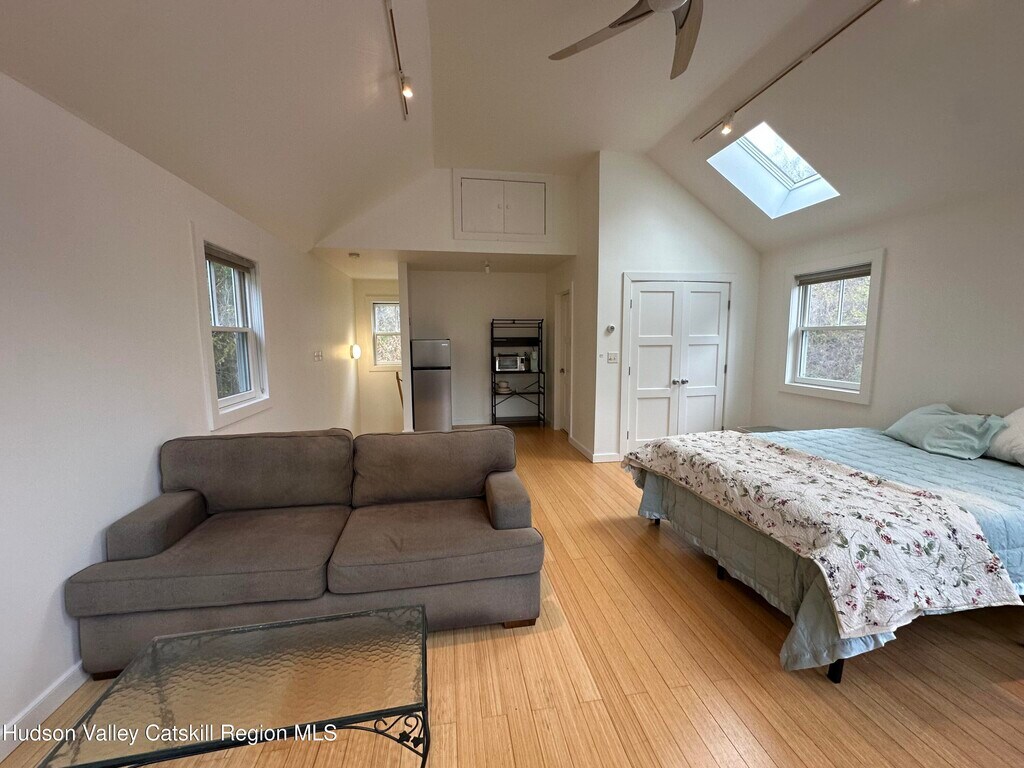 **Woodstock Winter Rental** Bright Studio Apartment above a garage,with kitchenette. Freshly painted approximately 504 square feet. French doors to personal deck,with beautiful country views. Ideal location,convenient to many amenities. Rent includes off street parking,electric,grounds maintenance,garbage pick up and snow removal. Tenant responsible for propane and cable/internet if wanted. Location is prime! Less than 2 miles to the center of Woodstock with access to the Trailways Bus route,restaurants,galleries,shopping,music and more. Outdoor enthusiasts will love and appreciate the proximity to hiking,biking,and skiing opportunities. Potential tenant must submit a rental application and current credit report . Renter's insurance required for term of lease. Rented partially furnished for Winter rental.