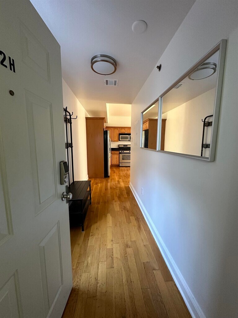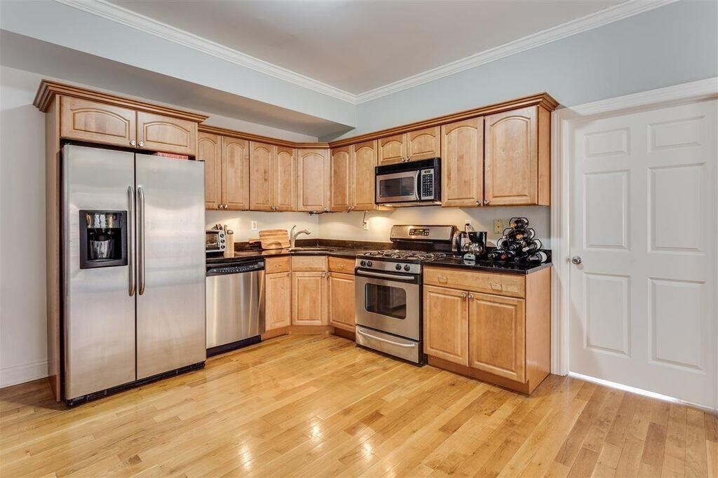 TODAY'S EASY CITY LIVING IN A GREAT LOCATION***WITH GARAGE PARKING INCLUDED!*** Beautiful and spacious two bedroom condo in a quiet residential building. Both bedrooms are large enough for Queen size beds and possibly a King size. Unit boasts an open floor plan and includes stainless steel appliances, granite countertops, hardwood floors, central A/C, and a private terrace from the living room looking down to the courtyard. Added perks for your convenience include a laundry room and an assigned storage closet on the same floor, security system to buzz visitors in - all in an ELEVATOR building. GARAGE PARKING INCLUDED with designated spot. Short distance to both local and NYC transportation and to the PATH trains; easy access to major highways. Enjoy dining experience at local restaurants. Easy access to shopping. Landlord will consider a cat or small dog. Some pictures are virtually staged.