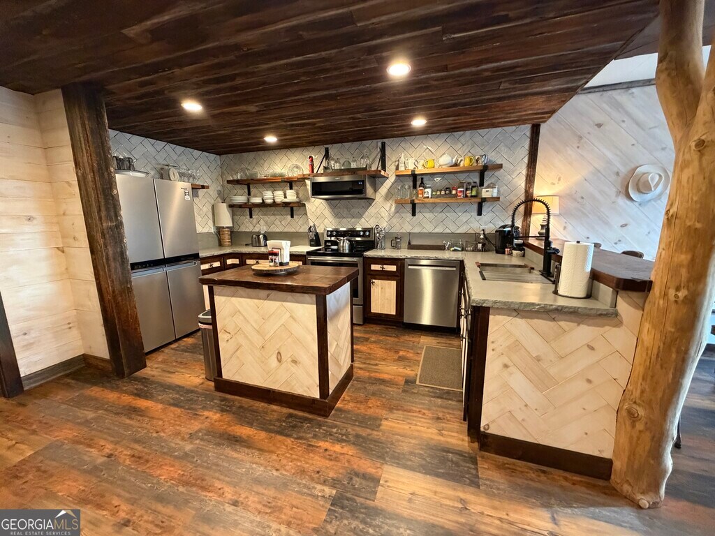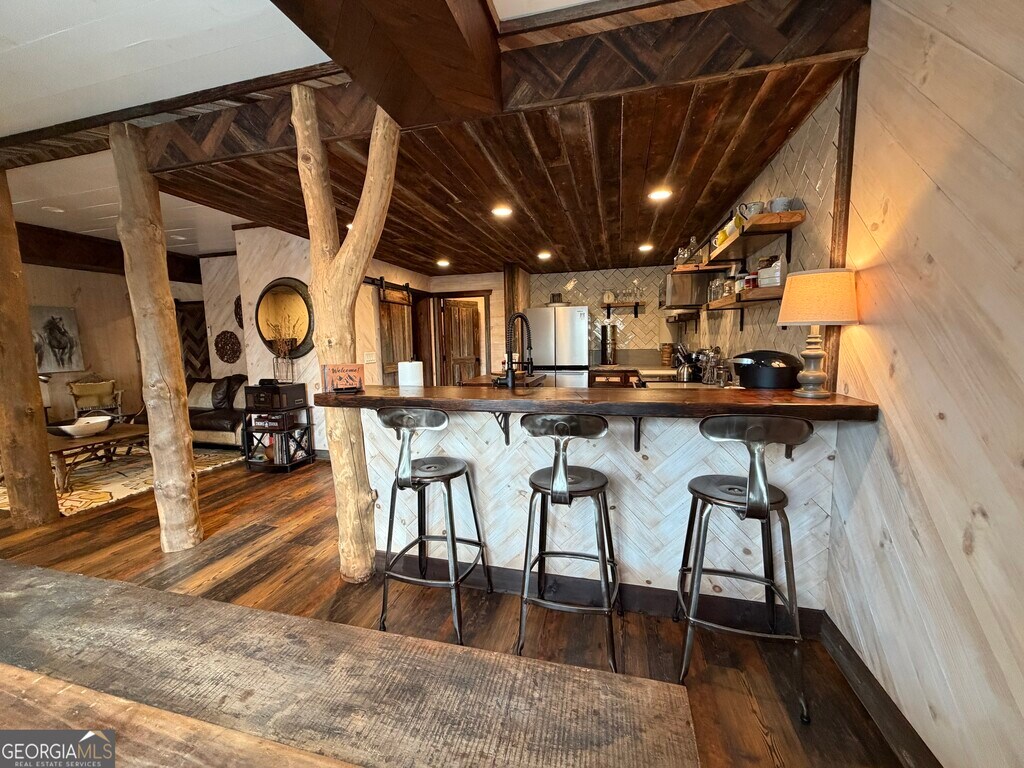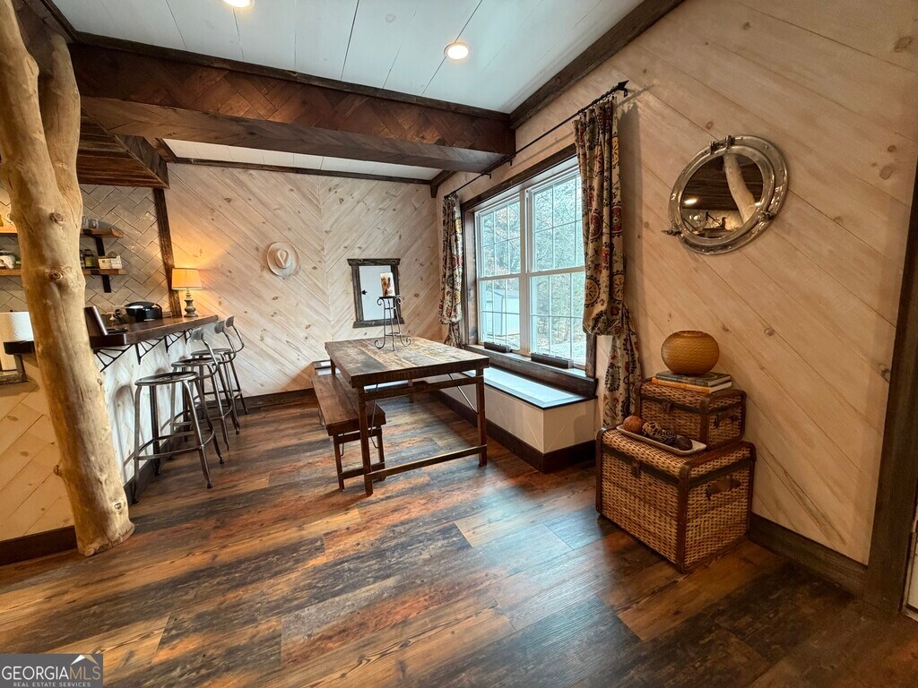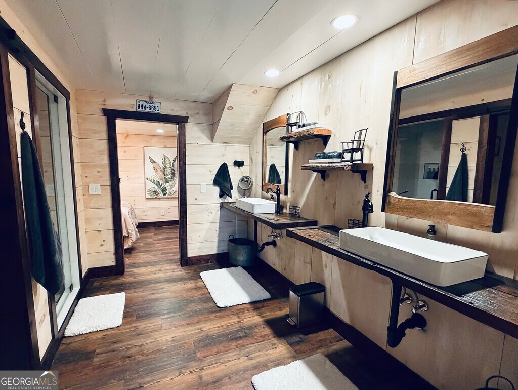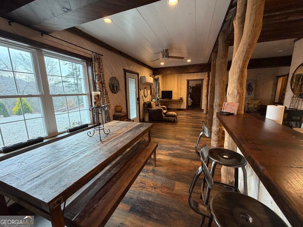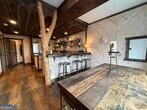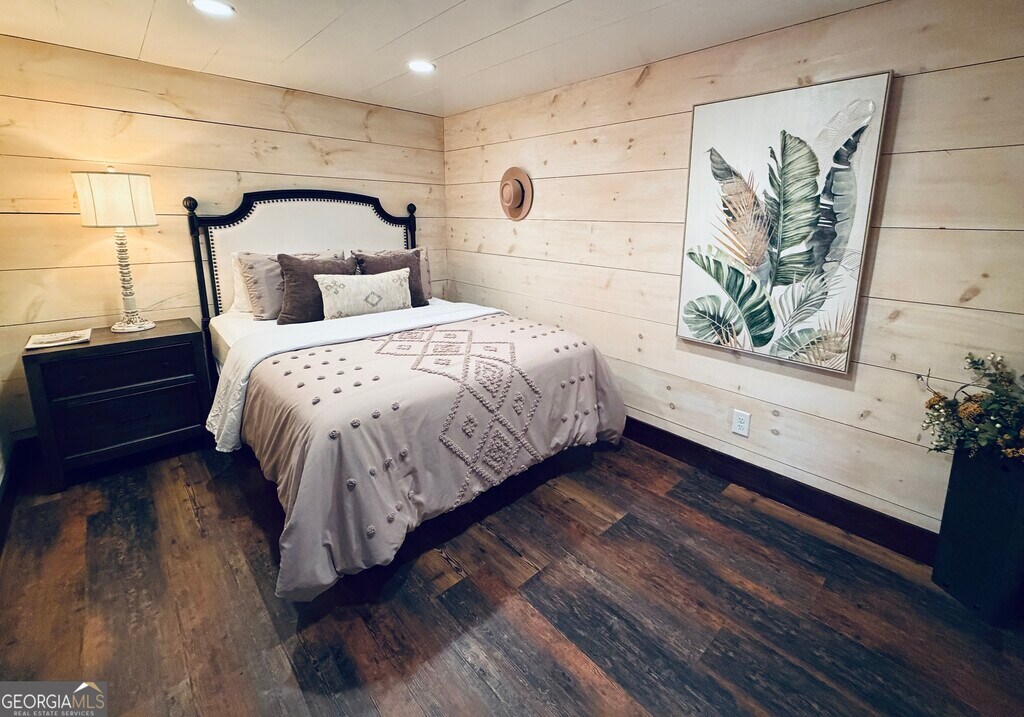 Step into this North Georgia Mountain retreat where rugged charm meets luxurious intention. This fully furnished 3 bedroom, 2 bath lower-level unit is just .4 miles (5 min walk) to downtown Clayton, GA The home is unique in every way. Each design detail has been locally sourced and masterfully crafted to create an immersive, lodge-style living experience you won't want to leave. The main living space features unique furnishings by renowned craftsman Don Bundrick, unique woodwork detail by Gerardo Mendoza and home grown natural log support posts. The rich dark LVP floors, and floor-to-ceiling shiplap walls give the home its signature warm, rustic cabin character. The expansive living area is anchored by curated western-inspired furnishings; leather sofas, artisan woven rocking chairs, and a cozy reading nook. The open concept living, dining and kitchen spaces flow seamlessly. The fully stocked kitchen boasts poured concrete countertops, surrounded by a live-edge wood bar, open shelving, modern stainless appliances, and herringbone tile backsplash; all encased beneath repurposed ceiling beams from an antique KY tobacco barn. Dining room seating includes a picnic bench flanked by a functional storage banquette that seats five. The home's three bedrooms continue the upscale cabin aesthetic with shiplap walls, recessed lighting, luxury linens and oversized closets. The primary suite features a custom herringbone wood headboard/wall, mirror accents, and built-in bookshelves; the perfect quiet retreat. The second bedroom offers a Sunbrella upholstered studded headboard on queen bed with nightstand. Bedroom three is outfitted with a stylish twin over double bunk bed, ideal for kids or extra guests. The two full baths are showstoppers. The main bath features dual vessel sinks on reclaimed wood floating vanities, live-edge wood-framed mirrors, exposed black iron plumbing, unique water closet and oversized walk-in tile shower. The second bath is a true western character piece, complete with genuine saloon-style swinging shower doors, open shelving and that signature cozy shiplap aesthetic throughout. Bathrooms designed with locally sourced reused tile and modern industrial plumbing. Wind down the evenings around your own private fire pit just steps from the front door overlooking the mountains. Perfect for cool North Georgia mountain nights of star gazing and story telling. A dedicated private parking area keeps your vehicles convenient. Nestled in the natural wonders of Rabun County, minutes from shops, restaurants, groceries, nightlife. Quick access to Tallulah Gorge, Lake Burton, Chattooga River, Black Rock Mountain, area vineyards, and miles of hiking trails. 15 min drive north to North Carolina and East to south Carolina state lines. This isn't just a rental - it's an experience where art and nature kiss. Contact listing agent today for showing! $2750 a month plus utilities *Upper level owner occupied on occasion* MLS ID 10734762
