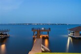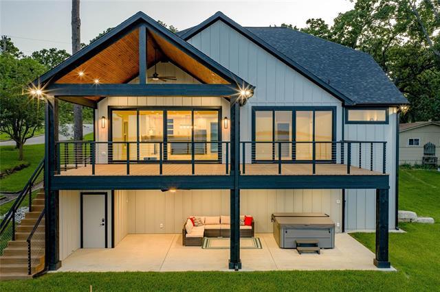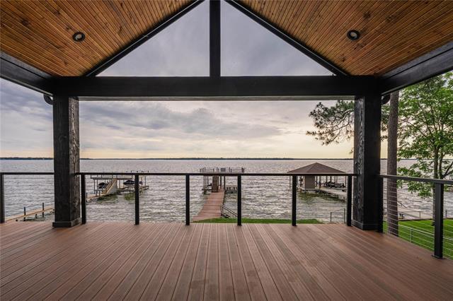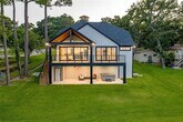 Experience lakeside living at its finest in this beautifully designed home that blends comfort, elegance, and effortless functionality. Wood flooring flows throughout the open living spaces, leading into a chef-inspired kitchen complete with gas cooking, quartz countertops, a large island bar, an ice maker, and a fully equipped butler’s pantry with a sink, and microwave. The primary suite offers a true retreat with glass doors opening directly onto the lakeside deck, while the spa-style bath features a soaking tub, rain head, and body sprayer for a luxurious escape. With three spacious bedrooms, two guest suites with double vanities, and a bunk room, the home easily accommodates families, groups, or long-term tenants. Indoor-outdoor living shines with a covered porch, open deck, and a lower-level patio with a hot tub overlooking wide-open water. A double boathouse with an upper deck sits on deep water, providing convenience and stunning views. This property is ideal for short-term stays, extended rentals, or full-time living, offering a rare combination of luxury, flexibility, and lakeside charm.