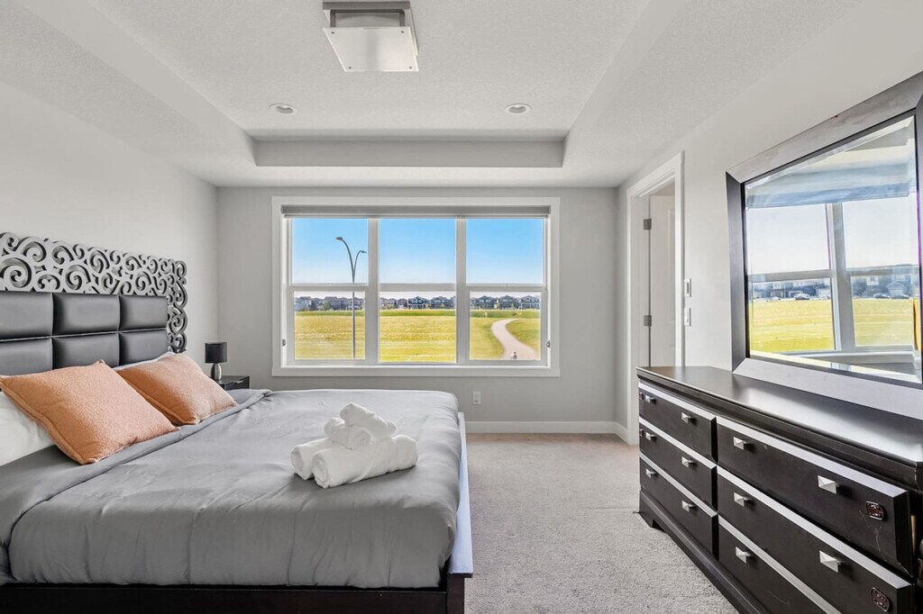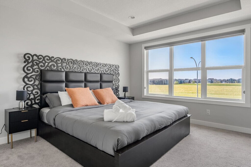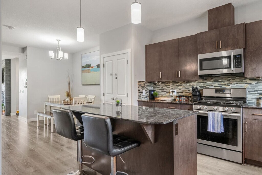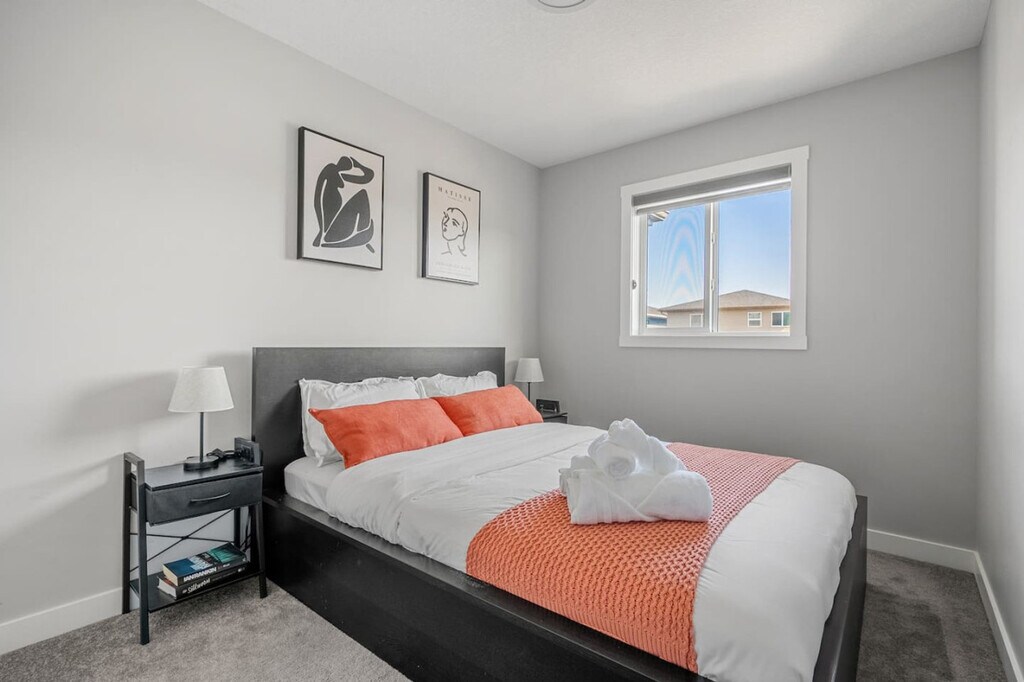 Experience a modern and cozy retreat in Cornerstone, complete with a secure double-car garage and just minutes from the airport. This inviting home offers a king-size bed with an en-suite bathroom, two additional premium queen-size beds, and a large queen sofa bed. With two full bathrooms and one half bathroom, you'll feel at home in this well-appointed space. The apartment boasts a fully equipped and stocked kitchen, featuring stainless steel and custom appliances, a 4-burner stove, oven, microwave, refrigerator, freezer, and dishwasher. Enjoy complimentary coffee and tea with a Keurig coffee maker, and dine at the table with kitchen island seating. Relax in the living room with a 58" smart TV with Netflix and an electric fireplace, all while enjoying centralized AC and heating. The property includes a two-car detached garage and street parking. Additional features include a washer and dryer in-unit with detergent provided, and a fireplace to keep cozy. A Banff Pass and unit fob/key are available for a charge of $200 each if not returned. Located just 1 minute from Cornerstone Marketplace for grocery, dining, and daily essentials, and 5 minutes from Stoney Trail for seamless city access. The property is 11 minutes from Calgary International Airport and close to various attractions like Genesis Centre, Prairie Winds Park, and CrossIron Mills. Quick access to major roads makes trips to Banff and Kananaskis a breeze. There is a separate basement suite with its own guests. The property enforces quiet hours from 10 pm to 7 am, and a strict no-smoking policy with a $250 CAD fine for violations. No parties, drugs, excessive drinking, or loud music are allowed. Unauthorized late check-out will result in an extra night stay or additional fees. A noise detector is in place to ensure compliance with the noise policy. High-speed internet is available throughout the apartment, making it remote work-friendly.