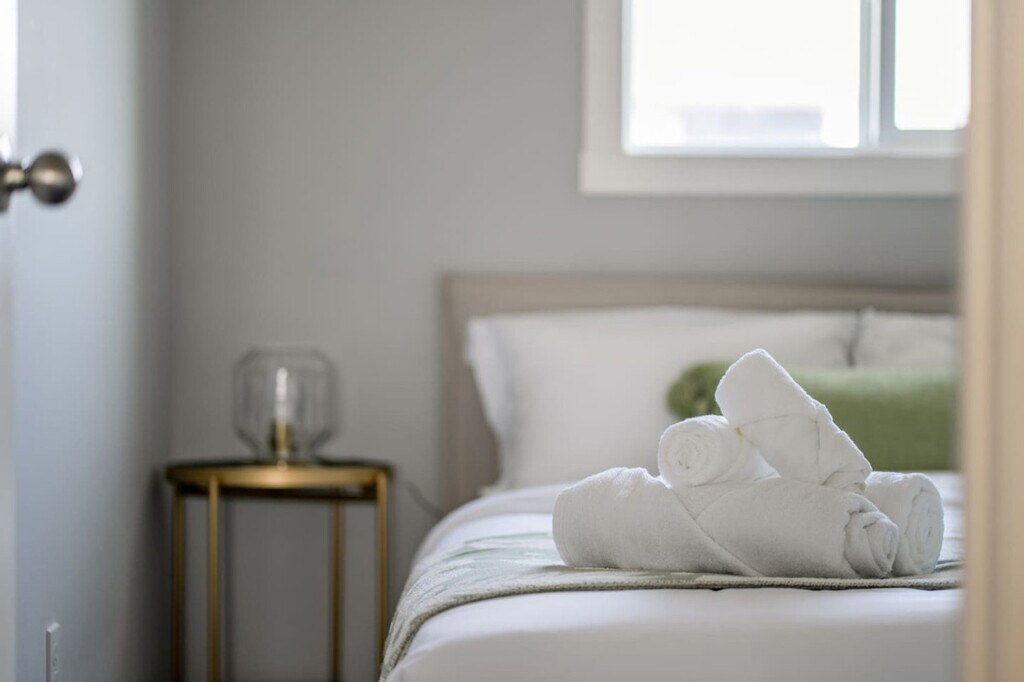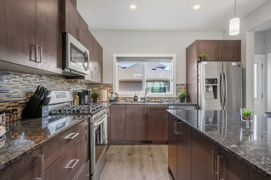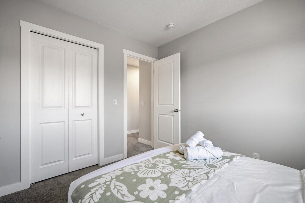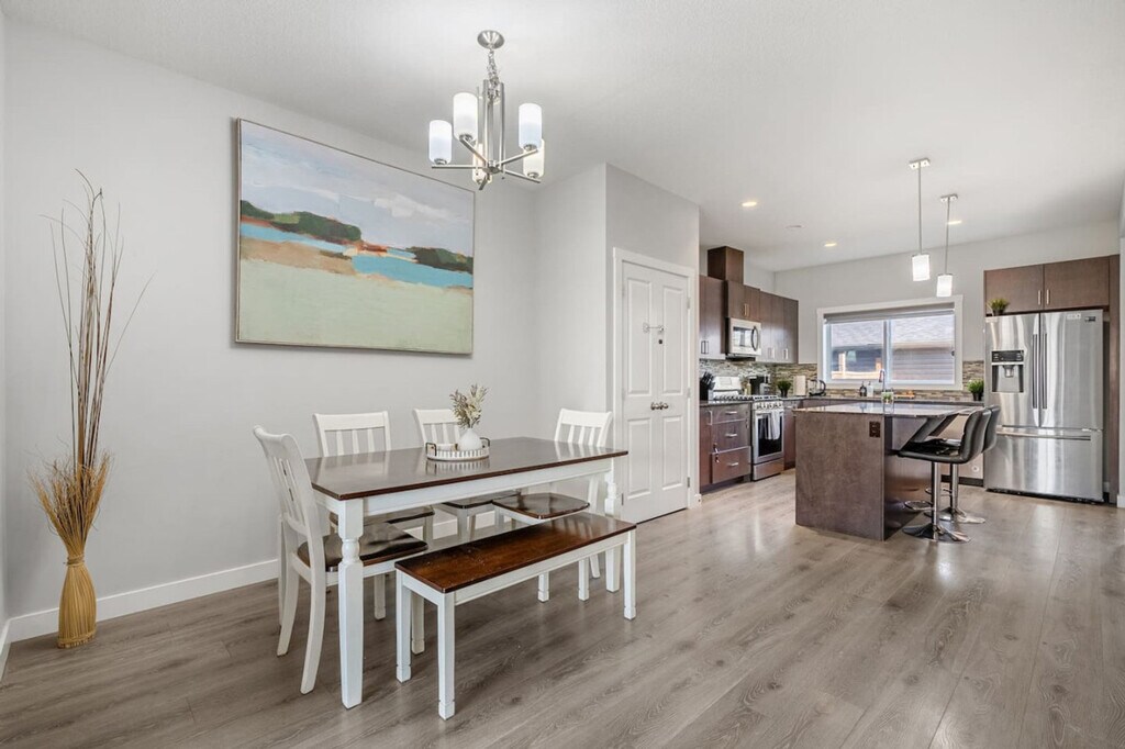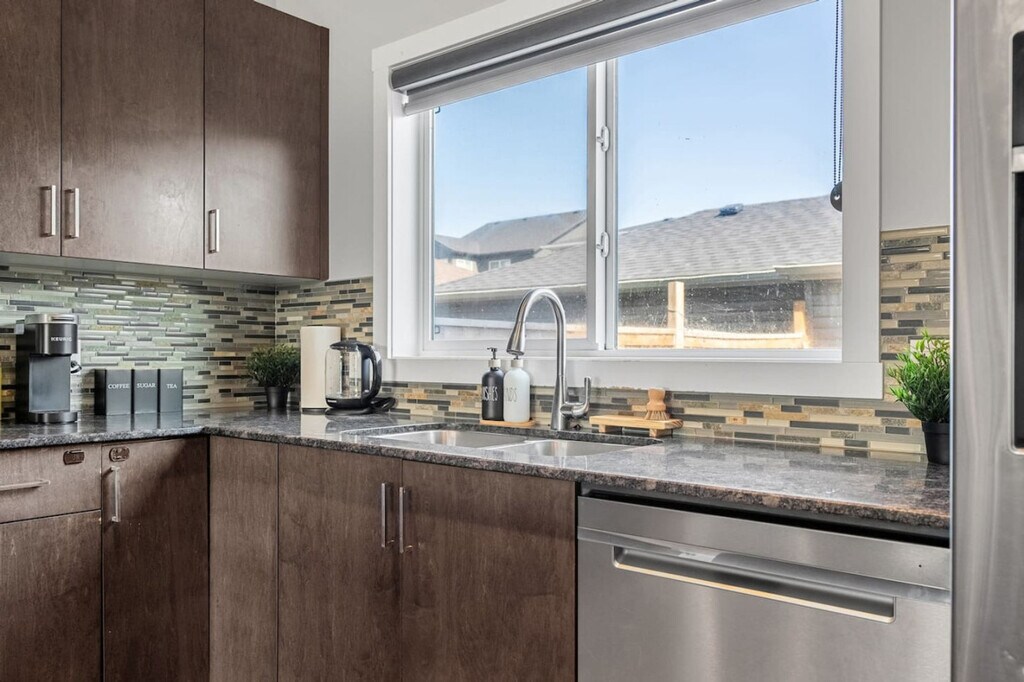 Experience a modern and cozy retreat in Cornerstone, complete with a secure double-car garage and just minutes from the airport. This inviting home offers a king-size bed with an en-suite bathroom, two additional premium queen-size beds, and a large queen sofa bed. With two full bathrooms and one half bathroom, you'll feel at home in this well-appointed space. The apartment boasts a fully equipped and stocked kitchen, featuring stainless steel and custom appliances, a 4-burner stove, oven, microwave, refrigerator, freezer, and dishwasher. Enjoy complimentary coffee and tea with a Keurig coffee maker, and dine at the table with kitchen island seating. Relax in the living room with a 58" smart TV with Netflix and an electric fireplace, all while enjoying centralized AC and heating. The property includes a two-car detached garage and street parking. Additional features include a washer and dryer in-unit with detergent provided, and a fireplace to keep cozy. A Banff Pass and unit fob/key are available for a charge of $200 each if not returned. Located just 1 minute from Cornerstone Marketplace for grocery, dining, and daily essentials, and 5 minutes from Stoney Trail for seamless city access. The property is 11 minutes from Calgary International Airport and close to various attractions like Genesis Centre, Prairie Winds Park, and CrossIron Mills. Quick access to major roads makes trips to Banff and Kananaskis a breeze. There is a separate basement suite with its own guests. The property enforces quiet hours from 10 pm to 7 am, and a strict no-smoking policy with a $250 CAD fine for violations. No parties, drugs, excessive drinking, or loud music are allowed. Unauthorized late check-out will result in an extra night stay or additional fees. A noise detector is in place to ensure compliance with the noise policy. High-speed internet is available throughout the apartment, making it remote work-friendly.