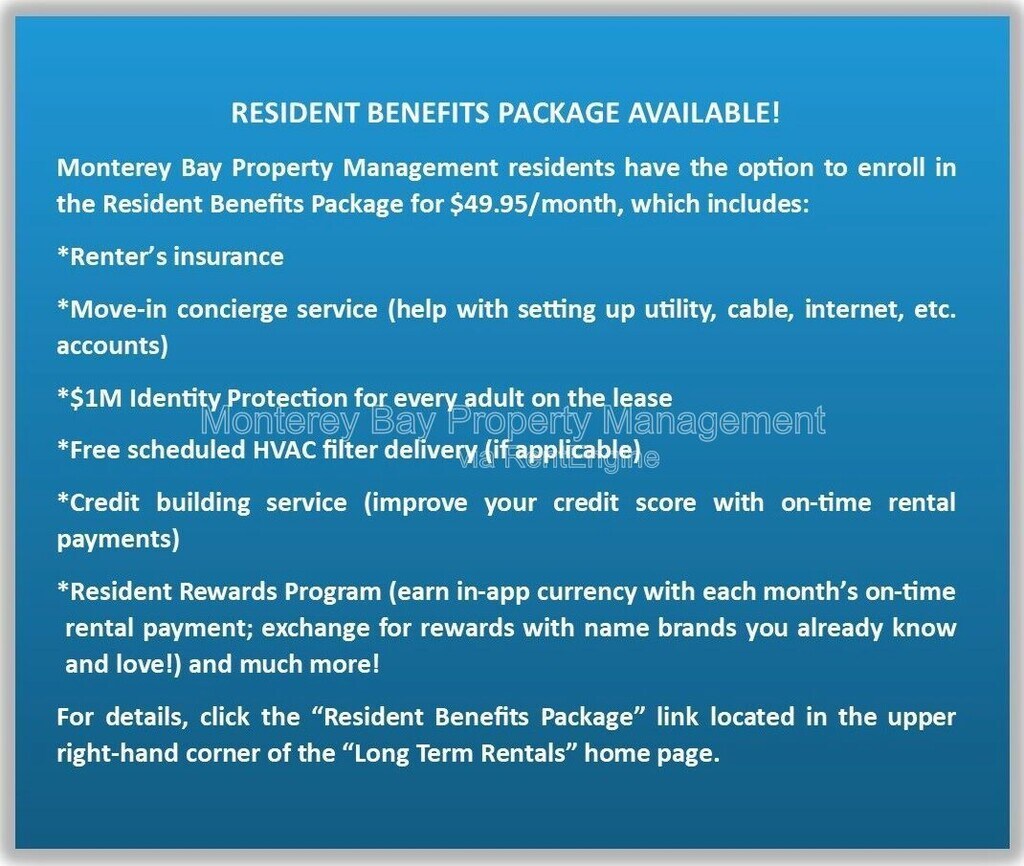 INITIAL INFO: Coming mid-April for viewings and move-in! Enter on the first floor which features a spacious living room, galley style kitchen and half-bathroom. Upstairs are the bedrooms and full bath, with shower over tub. One assigned off-street carport parking spot with small storage area. On-site laundry. Trash, water and landscaping are included in the monthly rent. Photos are not of the actual apartment, but a similar unit. Summary: • Two (2) bedrooms • One-and-a-half (1.5) bathrooms • Square footage: 1,100 • All service animals and ESAs welcome, when validated and approved through • Floor plan type: two-story • Utilities: Tenant is responsible for PG&E (gas & electricity) APPLICATION REQUIREMENTS • Each applicant 18 years and older must complete an application at (link below): • Each applicant 18 years and older must complete a profile at REGARDLESS of whether they have a pet (link below): • Meet company qualifying requirements. • Able to take possession of property within 14-21 days of availability date. • Must have excellent credit, employment and rental history background. • Favorable responses from references. • Evidence that applicant has the financial ability to pay the rent along with their other obligations. • Proof of income showing a rent to income ratio of 3 to 1 in the form of pay stubs, W-2 form, tax returns, bank statements, LES, or other documents. • We are unable to process applications if the Findigs application or PetScreening profile is incomplete or missing, or if not all applicants have applied. • Incorrect/misinformation/missing information may delay the processing of your application or may disqualify you as a prospective renter. All verifiable sources of income will be considered. Pursuant to Cal. Govt. Code §12955(o), for applicants with rental vouchers or subsidies, the income threshold will be calculated based on the amount of rent that will be paid by the tenant (not the entire rent amount). FEES AND INITIAL PAYMENTS: Monthly Rent: $2,800 Security Deposit: $2,800 Application Fee: $59 per Applicant Document Preparation Fee: $200 UPON APPROVAL • Proof of renter’s insurance (minimum $100,000 liability and $25,000 contents coverage) with landlord named as additional insured (note that the cost of this coverage is approximately $250 per year) is required of all residents. Renter’s insurance Declaration Page to be submitted in conjunction with signing the rental agreement. We operate on a first come, first served, and first qualified basis. Please be aware that Monterey Bay Property Management (a/k/a ) is a licensed real estate brokerage and does not advertise on Facebook Marketplace or Craigslist. We will never ask for Venmo, Zelle, CashApp, or PayPal to collect funds. If you suspect an ad has been posted by someone impersonating us or a property owner for whom we manage, please email us the information. If you believe one of our properties has been listed by a scammer, please email us the address and a link to the ad at info@. Your security is important to us. Property Manager: Matt Collins CalDRE# 01891198 Monterey Bay Property Management provides housing opportunities without regard to the perception that one is from a protected class or is associated with one from a protected class, or any classification protected by applicable federal, state or local law, or any other arbitrary reason. By submitting your information on this page you consent to being contacted by the Property Manager and RentEngine via SMS, phone, or email.