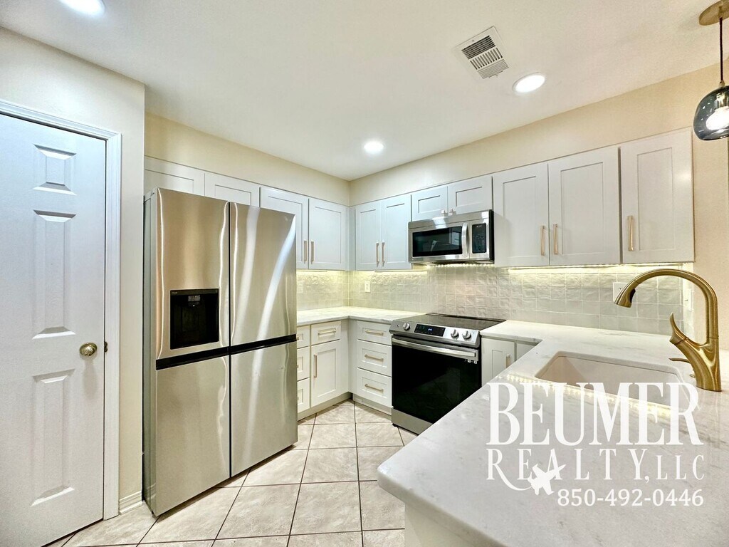 This spacious 1,620 sqft two-story home is situated in NE Pensacola available for a 12 month lease. Upon entry, you are welcomed into a well-lit and large great room featuring cathedral ceilings with tile floors. The first floor hosts master suite with a magnificent updated bathroom equipped with double vanities, recessed lighting, two walk-in closets, and a generous walk-in shower. The modernized kitchen is fitted with stainless steel appliances, an abundance of cabinet space, and a pantry. A breakfast bar offers a casual dining option, in addition to the adjacent dining room. For the convenience of guests, a half bath is available on the first floor, plus under-the-stairs storage. Downstairs combination of tile, carpet, and luxury vinyl plank flooring throughout. The second floor features a loft that overlooks the great room, alongside two additional carpeted bedrooms that share a remodeled bathroom with double vanities. Each of the upstairs bedrooms comes with spacious closets. Access to the screened-in porch, located off the kitchen, is provided through elegant French doors. The property also includes a two-car garage with washer and dryer hookups, as well as a fully fenced backyard. No smokers. Sorry – no pets! Application requires additional information (pay stub, rental reference, verification of Employment). Fee is $55 per adult over 18 years. A credit check and a min score of 630, background check, and rental verification required for applicants. Property manager is looking for overall credit payments made on time, ensuring you are not overextended on credit, no civil judgments, and debt to income ratio. Increased security deposit may be required. Elementary School: Ferry Pass Middle School: Ferry Pass High School: Pine Forest Call Beumer Realty for any questions .
