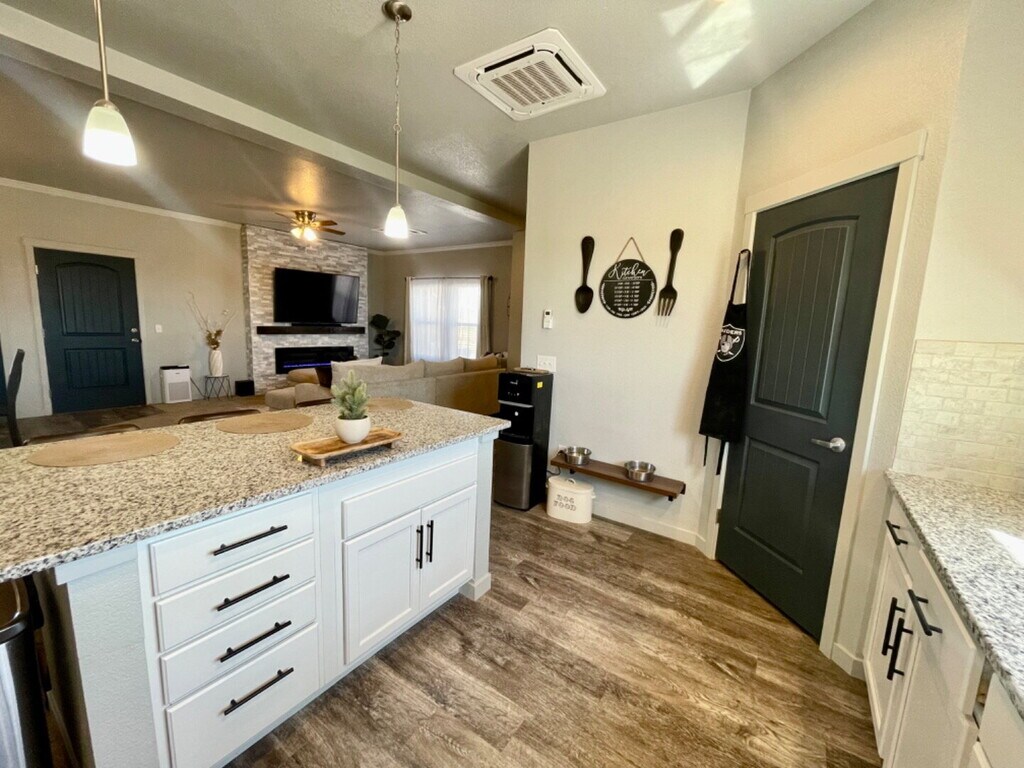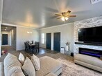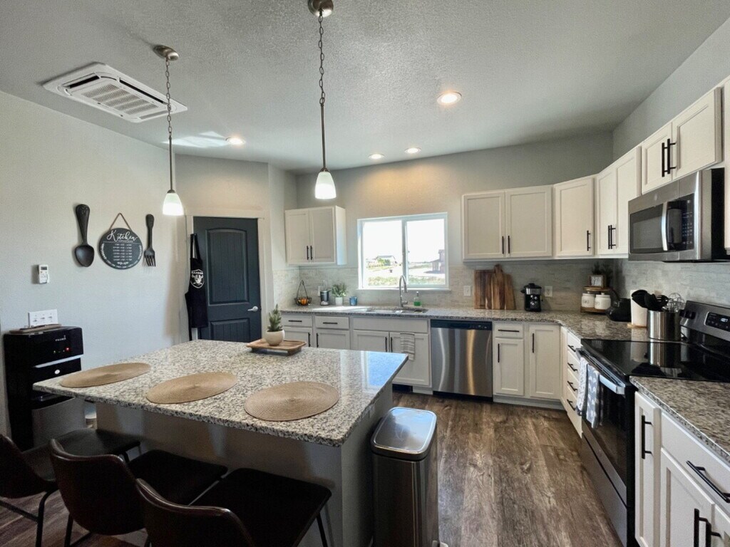 Welcome to 852 E Sandusky Drive! A beautifully maintained ranch-style home offering 1,656 square feet of bright, modern, single-level living in one of Pueblo West's most convenient pockets. From the moment you pull up to the charming red-accented exterior and oversized 3-car attached garage, you'll see this home was built for comfort, function, and easy Colorado living. Step inside to an open-concept floor plan featuring rich luxury vinyl plank flooring throughout, soaring ceilings, and an abundance of natural light. The spacious living room is anchored by a sleek electric fireplace and a striking accent wall is the perfect spot to unwind. The kitchen is the true heart of the home, complete with crisp white cabinetry, granite countertops, a generous center island with breakfast bar, walk-in pantry, and a full stainless steel appliance package including refrigerator, electric stove, microwave, dishwasher, and disposal. The adjoining dining area flows seamlessly to the living space, making entertaining effortless. The private primary suite is a true retreat, featuring a walk-in closet and a spa-inspired en-suite bath with dual vanities, granite counters, and a full tub/shower. Two additional bedrooms share a stylish full hallway bath, and a dedicated laundry room (washer & dryer included) adds everyday convenience. Enjoy year-round comfort with split system air conditioning and forced-air heating, plus blinds and ceiling fans throughout. Outside, the home offers an unfenced yard with mountain-view potential, a 3-car garage, and RV parking. Pueblo West is a master-planned community known for its wide streets, mountain views, and easy access to outdoor recreation. You're just minutes from Lake Pueblo State Park, Pueblo West Golf Course, Liberty Point schools, and the McCulloch Boulevard shopping and dining corridor. Quick access to Highway 50 puts downtown Pueblo about 15 minutes away and Colorado Springs roughly 45 minutes north. No HOA. Schedule your tour today, homes like this in Pueblo West don't last long!