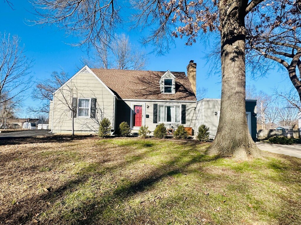 Charming Merriam home with ample space. Fresh, neutral paint throughout, Hardwood floors and arched doorways. Step into the spacious living room with decorative fireplace. Kitchen with eat in area and center counter for barstools provides tons of seating options. Main floor primary bedroom with huge walk in closet with washer/ dryer. Second main floor bedroom and shared full bathroom. Two additional bedrooms and full bathroom upstairs! Fully fenced yard with shed and fire pit. 1 car garage and two driveways! Unfinished basement. Sorry, no cats. Small dog considered on case by case basis.