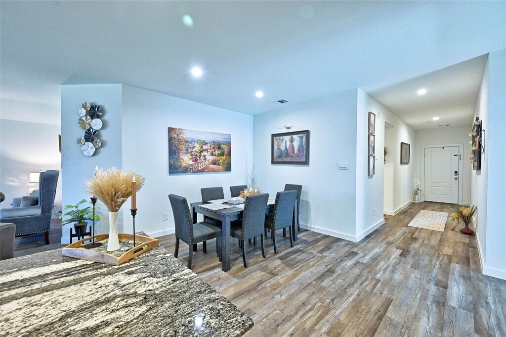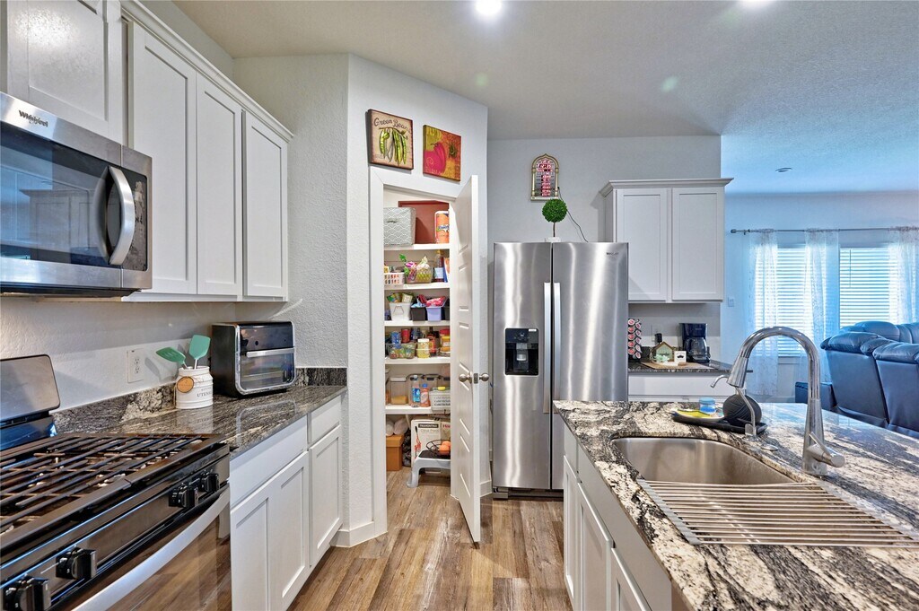 Stunning single-family one-story home featuring the popular Burnet floorplan. This spacious open layout spans over 2,199 sq ft &offers 4 bedrooms,a pvte study,3 full bathrms,& a 2-car garage.A welcoming foyer leads into the open-concept living area,where the kitchen overlks the expansive family rm,perfect for everyday living &entertaining. The kitchen is well-appointed with granite countertops,a walk-in pantry,ample cabinet space,a breakfast bar &modern appls. A formal dining rm adds elegance &versatility for hosting gatherings.The primary suite provides a serene retreat with a pvte en-suite bathrm featuring dual vanities &an oversized walk-in shower. 3 additional generously sized bedrms are complemented by 2 full bathrms,offering comfort &pvcy for family &guests. Enjoy outdoor living with a covered patio &a privately fenced backyard,complete with a fully sodded lawn & irrigation system. This home blends style& functionality in a desirable 1 story design.All appls included. MLS# 90808994