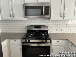 Beautifully upgraded home in quiet community with swimming pool and play ground just 1.5 miles from Lackland AFB. Upgrades include rare 12'x30' patio for outdoor enjoyment, quartz island kitchen with designer subway tile backsplash, stainless appliances including a brand new Frigidaire refrigerator, microwave and gas cooking for the gourmet chef with upgraded dining room chandelier. Video doorbell and garage door opener with two remotes and external camera and keypad. P Front yard welcomes visitors with river rock-enhanced flower bed. Don't miss this opportunity to enjoy new home living!! This 4 bedroom, 2 bath single story home offers an open floorplan. Walk-in closet in private Primary Bedroom separated from the three secondary bedrooms. Quartz counters in bathrooms, contemporary wood-look flooring throughout living areas. Brand new Maytag washer/dryer included. Privacy fencing and irrigation system. 2-car garage and tankless water heater.