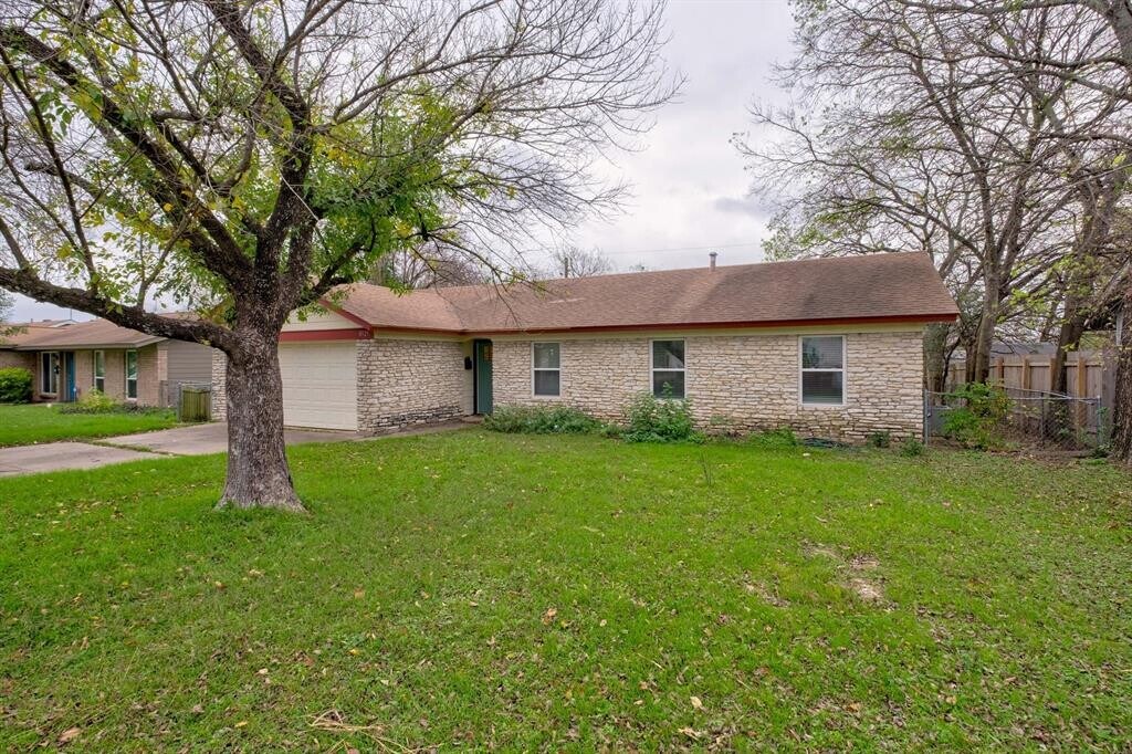 Set in Central North Austin, this updated home offers a solid mix of function and thoughtful upgrades. The exterior features a stone facade and established landscaping, with a straightforward layout inside that’s been refreshed throughout. Wood-style laminate flooring runs across the main living areas, paired with new interior doors and matte black Schlage hardware. Fresh paint, updated lighting, and added trim give the space a more finished feel without overdoing it. The living room centers around vaulted ceilings with exposed wood beams, opening into a kitchen with a breakfast bar and everything you need for daily use. All three bedrooms are well-sized, including a primary suite with a walk-in closet, double vanity, and a walk-in shower with updated tile. The secondary bathroom has also been updated with a Restoration Hardware vanity, marble countertop, and Delta fixtures. Out back, there’s a fenced yard with a patio area and room to use it. Two-car garage. AC has been serviced. Location is a strong point—easy access to major highways, tech employers, grocery, and everyday spots. MLS ID 9555783
