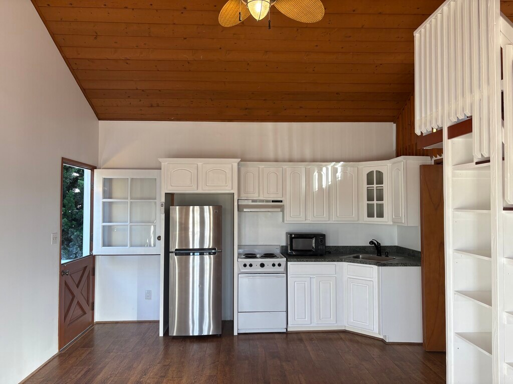 Free standing 400 SF studio located above detached garage. Kitchen, walk in closet, 3/4 bath and small loft. Large balcony with sunset views. Utilities included. Laundry in garage below. Plenty of street parking in front of property. Less than 1 mile to the beach via the greenbelt.