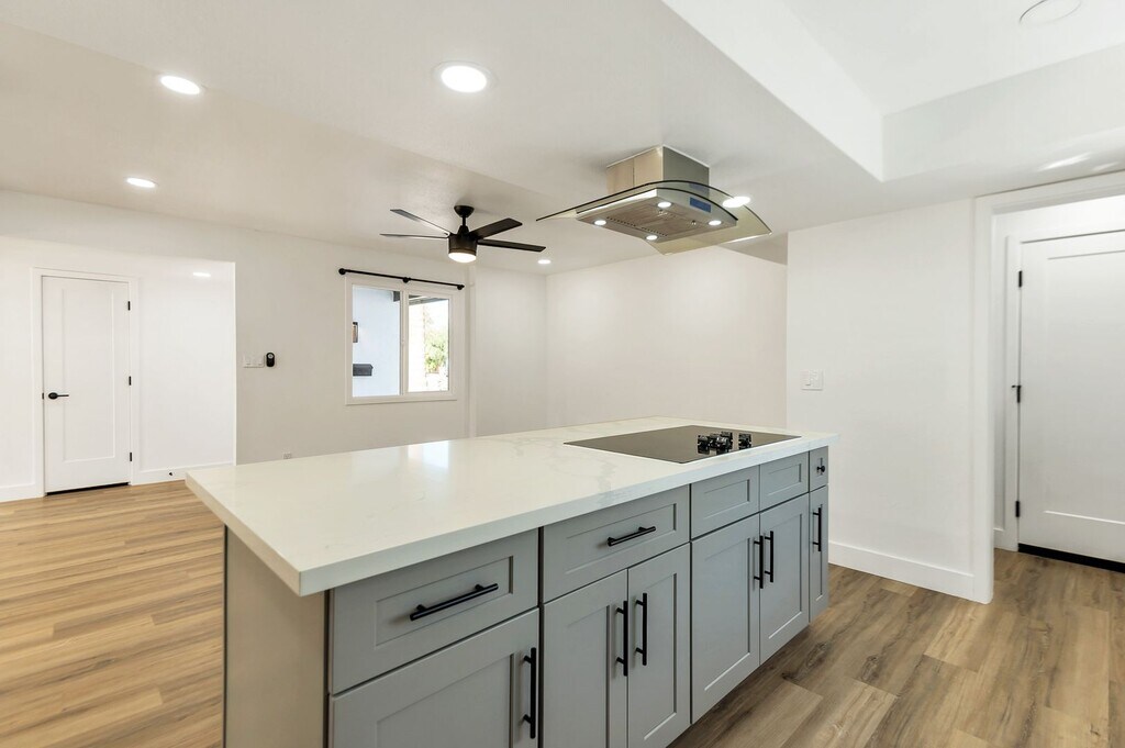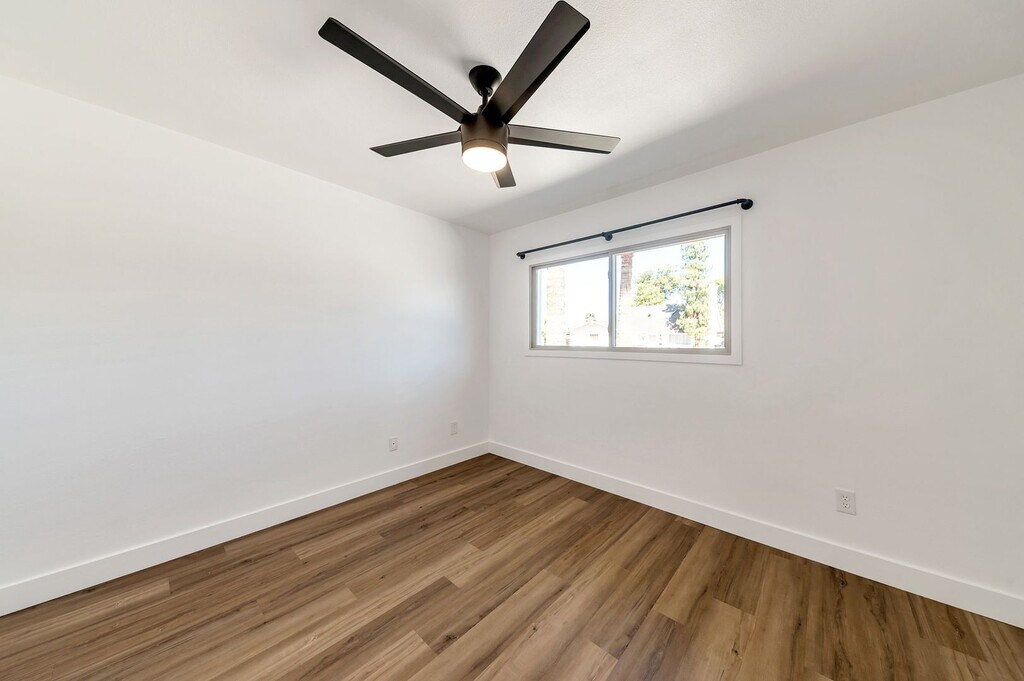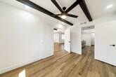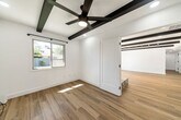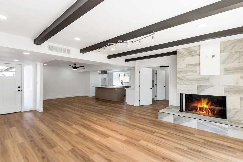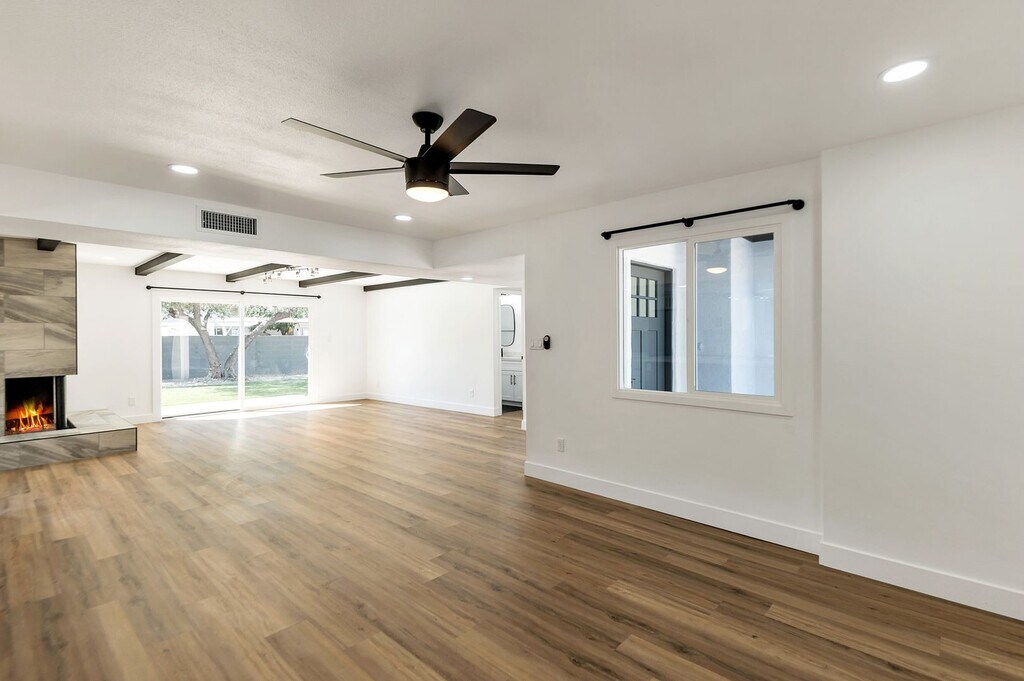 3 Bed 2 bath plus bonus room. Tastefully remodeled in 2021. Quartz counters. Open concept. Breakfast bar. Bonus room, office or den. Wood floors throughout. Home is light and bright. North / South facing. Lots of parking. Open yard. Artificial grass in backyard. Landscape service included. Full two car garage with sealed floors and second fridge. Garage has separate AC (mini split unit) and can be used as flex space. Other updates in 2021: New Electric panel, New AC units (mini split and roof unit), New water heater. All new appliances, including Bosch drawer microwave. Unit is unfurnished. Unit will include wall mounted TV above fireplace with mount.