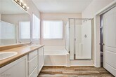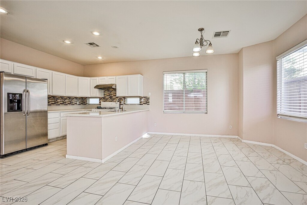 Located at Blue Diamond and Decatur, this modern home offers convenience within walking distance to groceries, banks, and a variety of eateries. Step into a spacious, airy entrance with high ceilings, leading to an open-concept living room seamlessly connected to a formal dining area. The home features custom subway floor tiles, a large eat-in kitchen counter, and ample cabinet storage. Upstairs, find three generously sized bedrooms and an open loft, perfect as a secondary living space or home office. The backyard is designed for carefree maintenance and ideal for outdoor entertaining. Applications are reviewed Monday through Friday during office hours, with the lease starting within 10 days of approval
