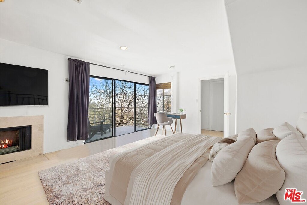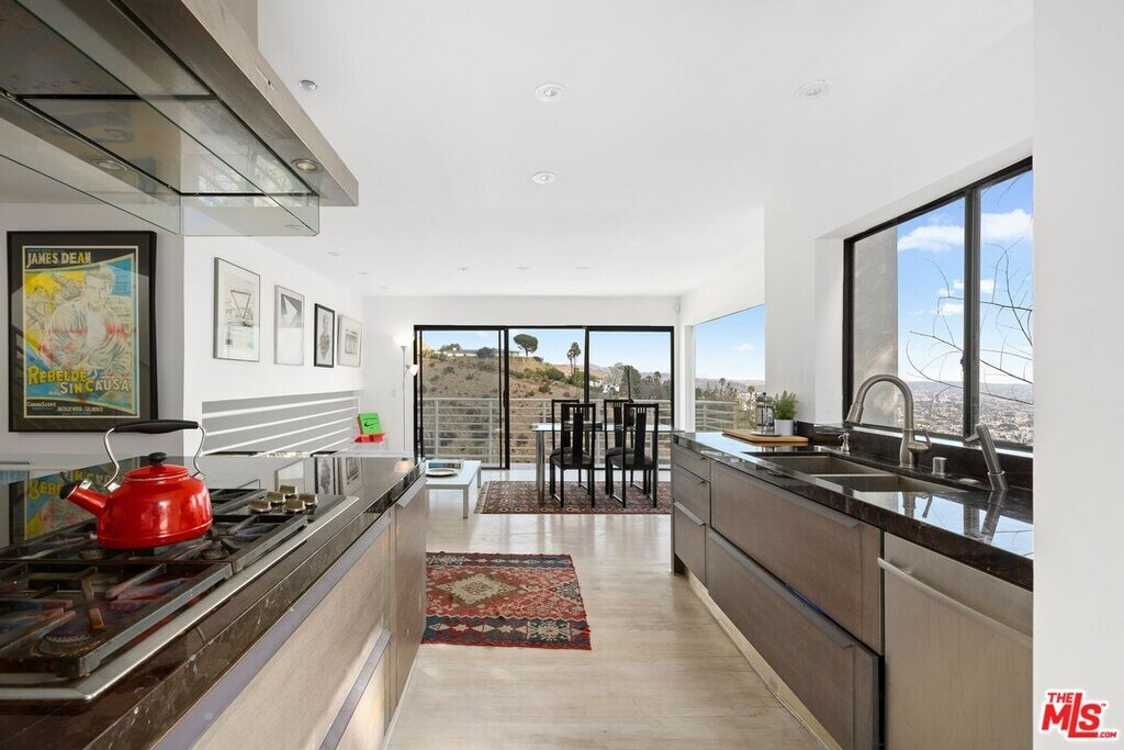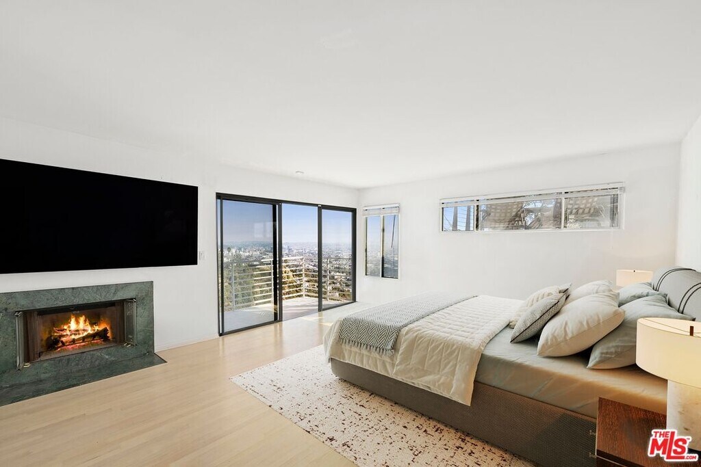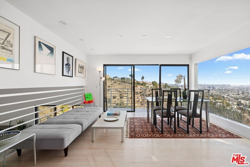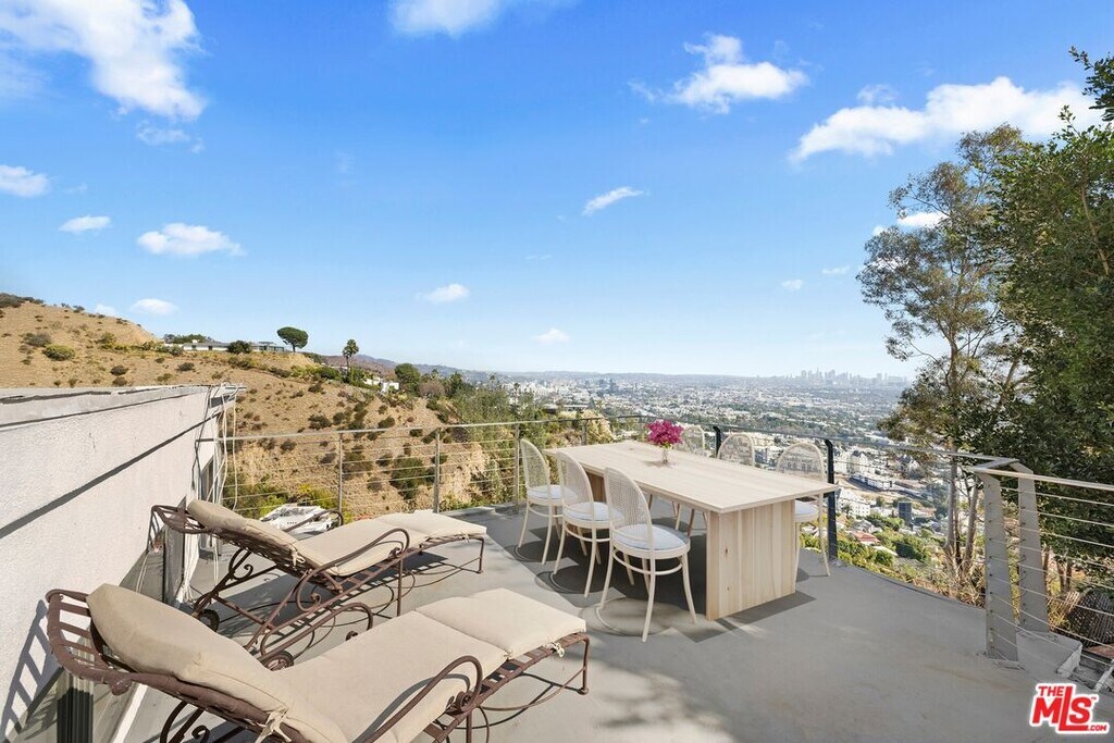 Located on coveted Hillside Avenue in the Hollywood Hills, this 3-bedroom, 3.5-bath multi-level architectural home offers sweeping jetliner views and a refined blend of contemporary design and modern comfort. Spanning 2,547 square feet, the residence captures panoramic vistas from the canyon to the Los Angeles skyline through expansive southeast-facing glass walls that flood the interiors with natural light. The open-concept layout features a gourmet kitchen with custom cabinetry, marble countertops, a center island, and premium appliances including a Wolf range, Sub-Zero refrigerator, and Viking stove. The dining area opens to a spacious balcony ideal for enjoying unobstructed city views. The living room includes a fireplace, wet bar, and additional balcony. The upper level hosts a luxurious primary suite with a spa-like bath, jetted tub, walk-in closet, fireplace, and private balcony, along with a versatile bedroom or office with en-suite bath. A rooftop deck crowns the home, perfect for entertaining or relaxing. The lower level offers a second primary suite with en-suite bath, fireplace, private balcony, and nearby laundry room. Additional features include a tankless water heater, dual-pane windows, central air conditioning, a custom Italian spiral staircase, an attached one-car garage, and ample street parking. Minutes from hiking trails, West Hollywood dining, and the iconic Chateau Marmont, this fully furnished residence delivers exceptional architecture, location, and views. MLS# 26650967