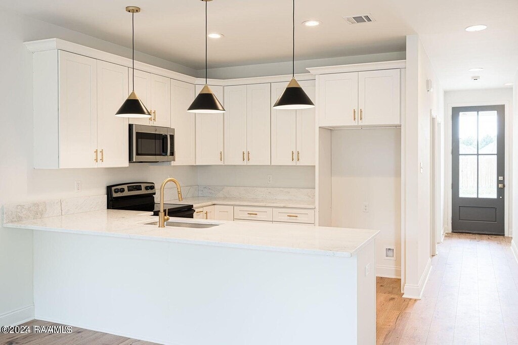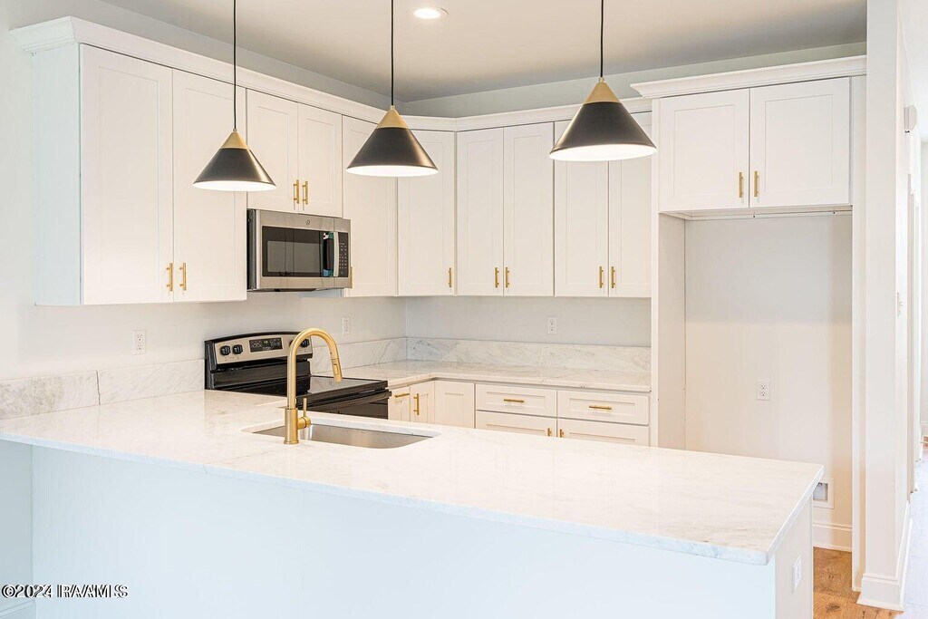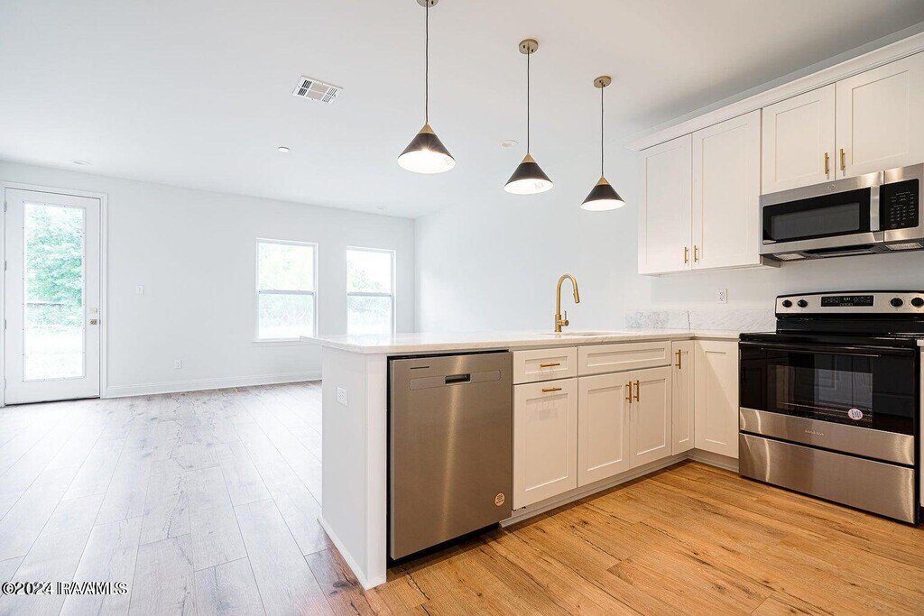 This home has a spacious open floor plan, perfectly designed for modern living, creating a seamless flow between the kitchen and living areas. The kitchen is a true highlight featuring dolomite countertops allowing you to prepare meals with pleasure in this modern and stylish space. Throughout the home, the wood laminate flooring is durable, low-maintenance, and perfect for a busy lifestyle. Custom, modern lighting fixtures and gold accents throughout the home elevate the ambiance. This home is situated on a private dead end street, providing a peaceful setting with Lafayette only a short 10-minute drive away. Schedule a viewing today!