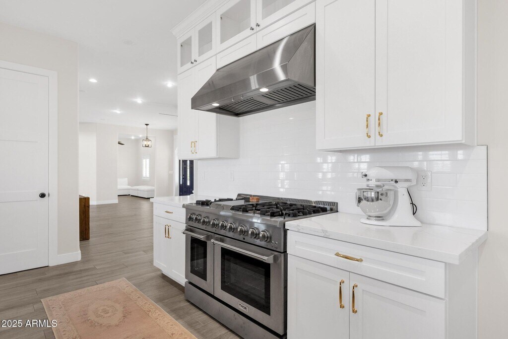 Luxury 5,654 sq. ft. estate on 2.57 acres of flat land in a private cul-de-sac. No HOA. Full remodel to the studs in 2021. High-end finishes,vaulted ceilings,massive game room/den,oversized Jack-and-Jill suite,in-law suite,and tons of storage. Downstairs includes master suite plus separate office/fitness room. Separate laundry rooms on both floors (washer/dryer included downstairs). Backyard includes fully fenced pasture with custom chicken coop. Fruit orchard with citrus,stone fruit,figs,mulberries,and pomegranates. East-west facing with stunning light and views. Fully mature shade trees in the front block afternoon sun. Maturing shade trees planted all along back of property. Detached ~2,000 sq. ft. 5-car garage w/ high ceilings. Ample parking. ICF construction. Mountain views.