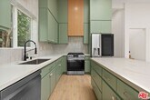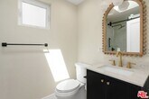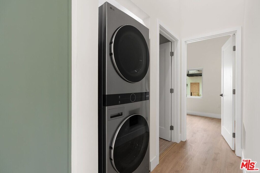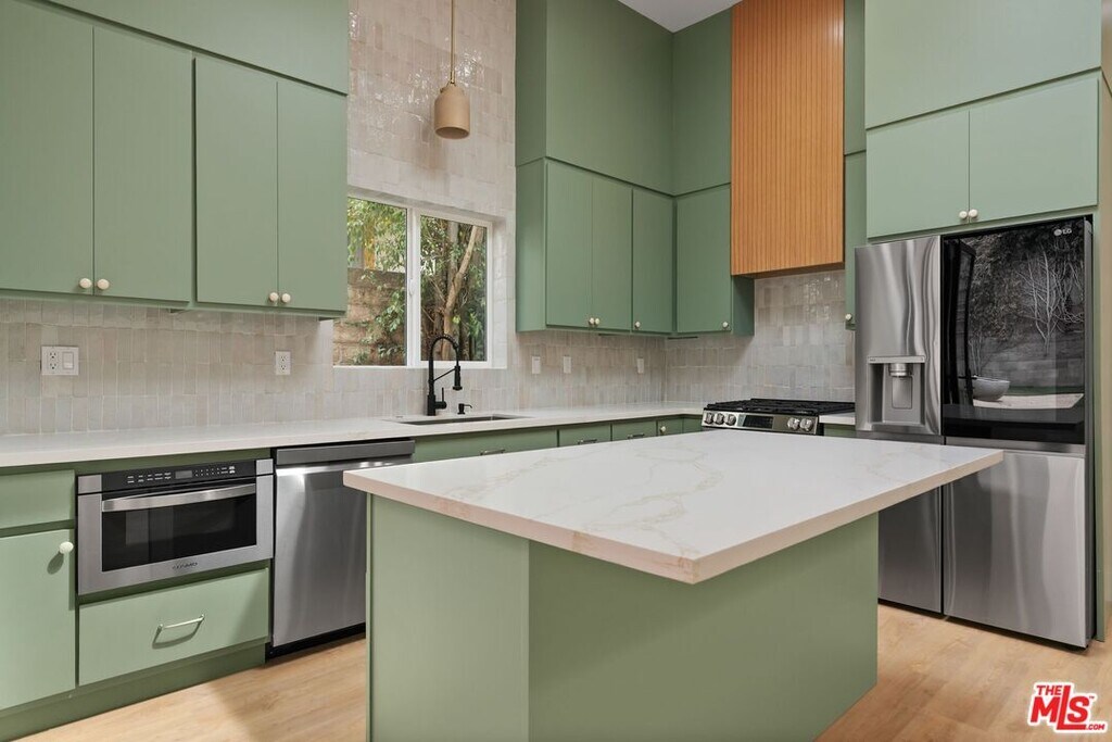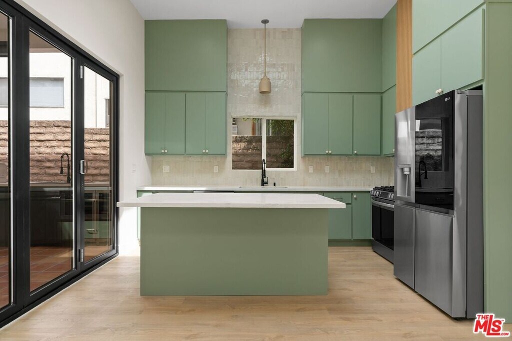 Be the FIRST to live in this Private Minimalist Retreat conveniently located in the trendy Tr-West community of West Hollywood. Thoughtful GREEN inspired design provides open living & dining space with tall ceilings, recessed lighting, and multiple skylights for natural light exposure. Kitchen has spacious breakfast island, plenty of Quartz stone counterspace, custom cabinets, modern & energy efficient stainless steel appliances. Impressive tall glass folding doors flow to exterior covered patio w/skylight, custom cabinetry surround built in barbecue, wine refrigerator, set on beautiful sausalito tile . Private Green landscaped backyard has turf for easy maintenance and custom blue glass firepit. Two bedrooms located on main floor and one upstairs, Split AC/Heat Units in every room, reengineered hardwood floors w/quiet sound underlay throughout, Stack/Washer Dryer, 2 car carport parking...shared drive isle. Quality New Construction worth your time to Tour. MLS# 25604553