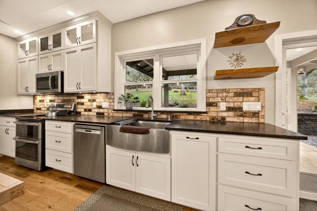 Situated between Jacksonville and Grants Pass, this beautifully maintained country home sits on over 4 acres and offers peaceful Applegate Valley views from the covered front deck. The open-concept 2 BD 2 BA layout features solid oak hardwood floors, vaulted ceilings, and a spacious living room w/ a wood stove that opens to the kitchen and dining area. The kitchen includes granite countertops, a butcher block island, custom cabinetry, stainless appliances, and a farmhouse sink. A generous pantry off the kitchen provides exterior access and connects to the guest bathroom that doubles as a laundry room. The primary suite opens to a private patio overlooking the garden and features an ensuite with walk-in shower, double vanity, and touch-light mirrors. Outside you’ll find a detached 2 car garage, fenced in garden, fruit trees, wood storage, and manicured grounds. Offered on a month-to-month rental agreement, w/ the hope of securing a long-term tenant. Landscape maintenance is included. *
