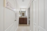 This 3-bedroom, 2.5-bath townhome is available now and ready for immediate occupancy. Residents enjoy access to a community pool and a peaceful nature trail, along with a prime location just minutes from I-75, The Shops at Wiregrass, and the many dining and shopping options in New Tampa. The home is zoned for Turner, Bartels, and Wharton schools. Inside, the second floor features brand-new carpeting, a spacious loft ideal for a home office or bonus living area, and a generous primary suite with a walk-in closet and a private bath complete with dual vanities, a garden tub, and a separate shower. Two additional bedrooms, another full bathroom, and a laundry room with a full-size front-load washer and dryer complete the upstairs layout. Downstairs, you'll find fresh interior paint, attractive wood-style laminate flooring, and an open-concept design perfect for modern living. The kitchen offers granite countertops, stainless steel appliances, and a convenient breakfast bar with sink that overlooks the combined living and dining space. Sliding glass doors open to a screened patio and extended paver area ideal for entertaining or simply unwinding outdoors. No cats permitted. One or two small dogs under 20 lbs may be considered with registration and deposit. No co-signers allowed. All adults must apply, sign the lease, and complete individual screening.